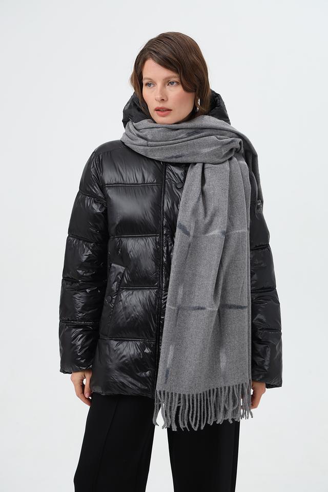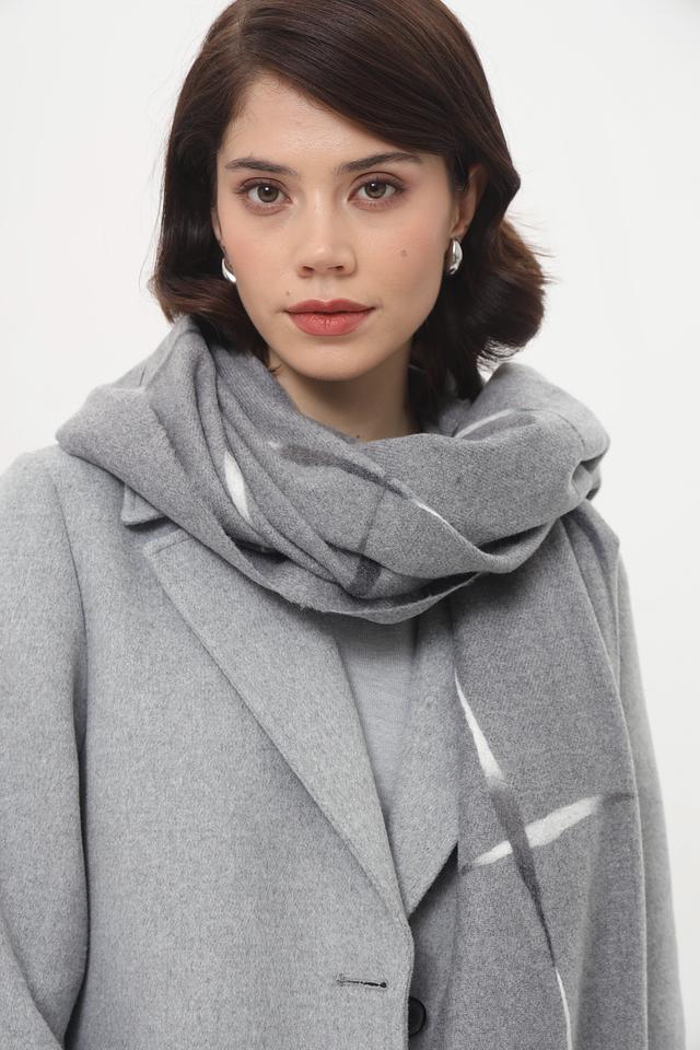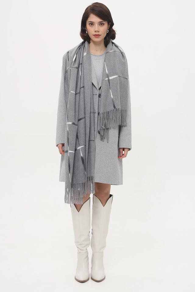 Дизайн шарфа украшен геометрическим принтом в виде светлых полос, расположенных в клетку. По всему периметру шарфа присутствует длинная бахрома, добавляющая ему изысканности и динамики.