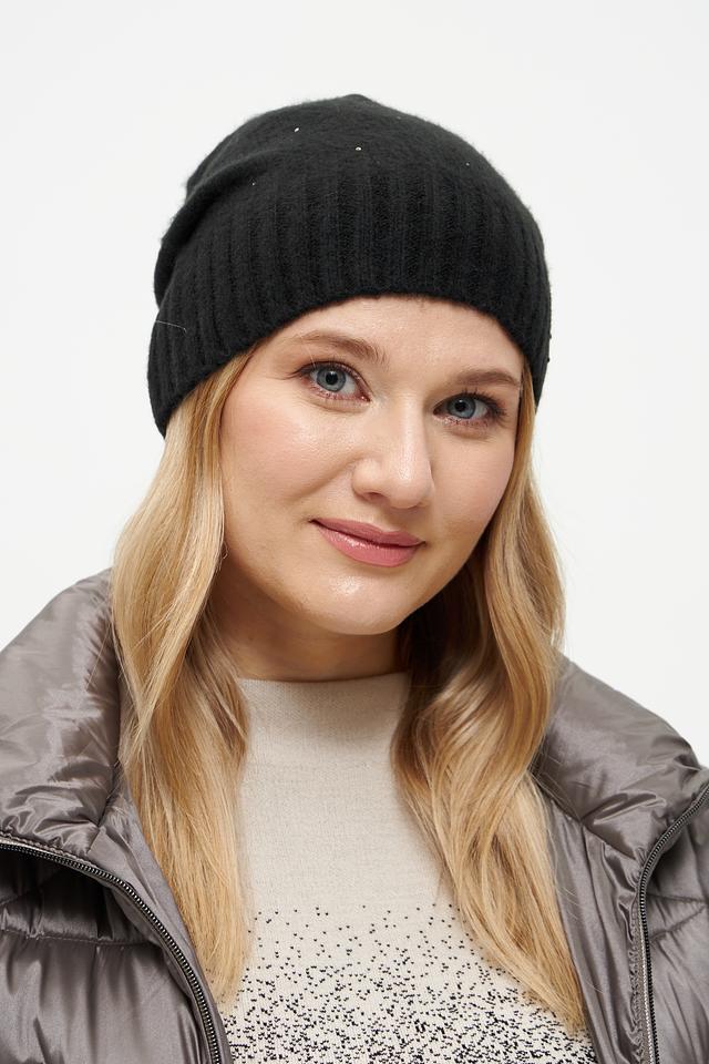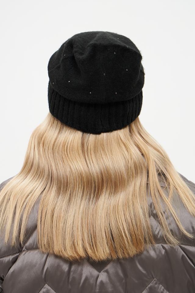 Шапка имеет удобный крой, плотно прилегающий к голове, но не сдавливающий её. Декоративные элементы в виде страз придают шапке изысканность и индивидуальность.