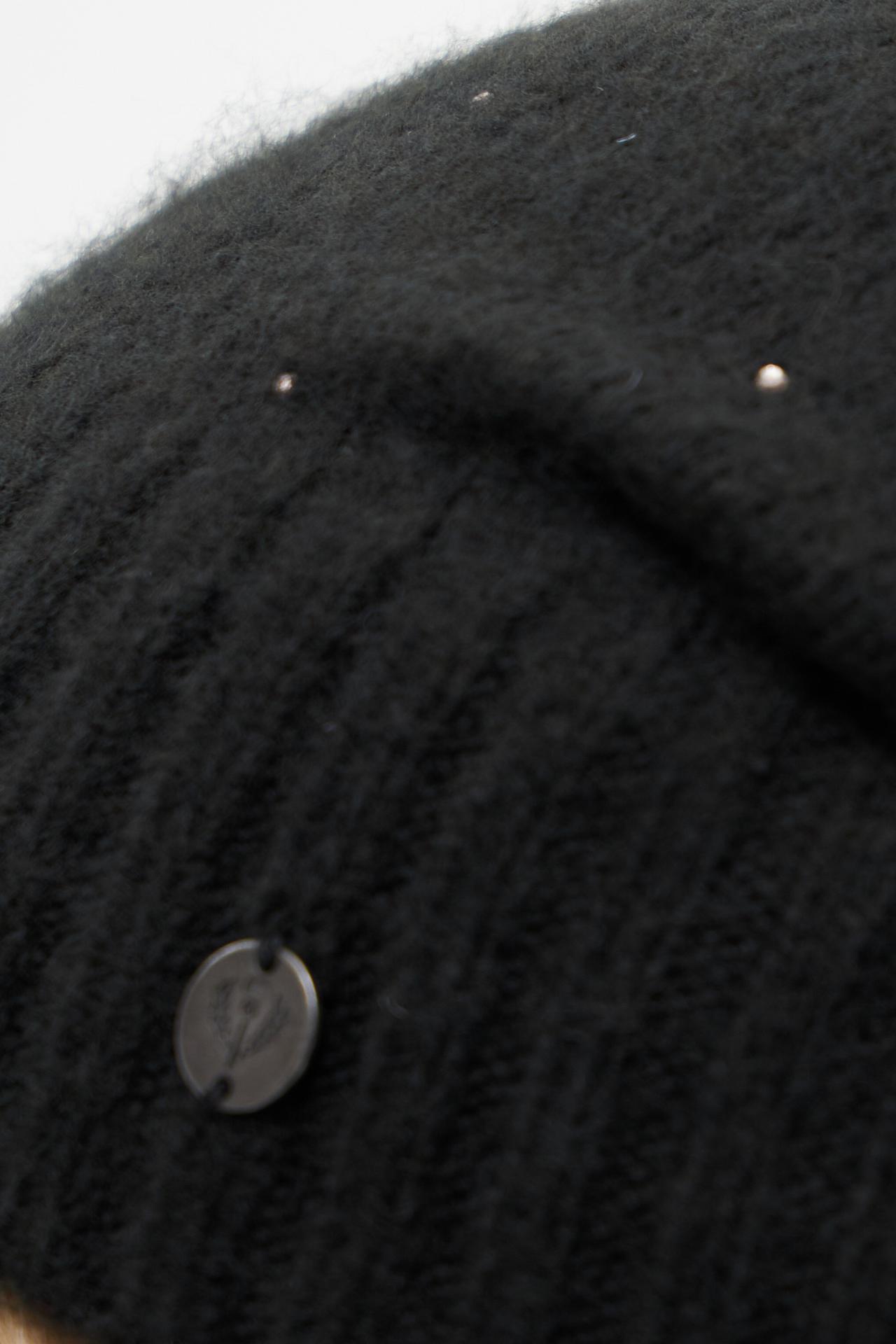 - Дизайн: Классическая модель бини с отворотом, украшенная деликатными стразами. Шапка легко адаптируется под индивидуальные предпочтения, позволяя создать как более облегающий, так и более свободный силуэт.