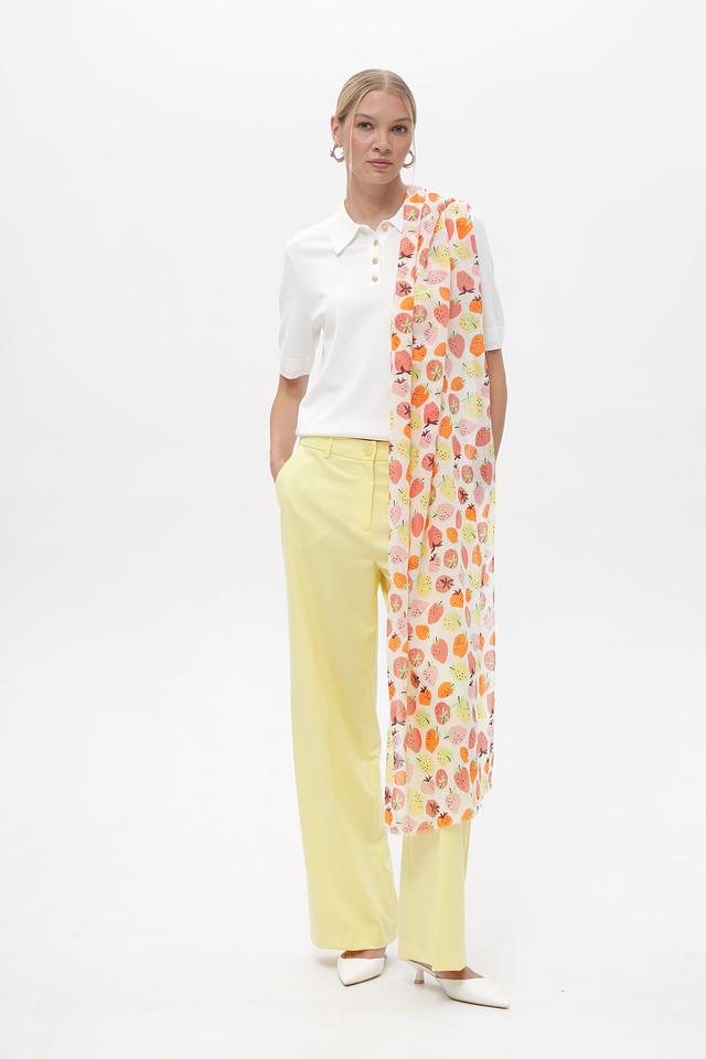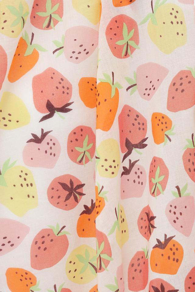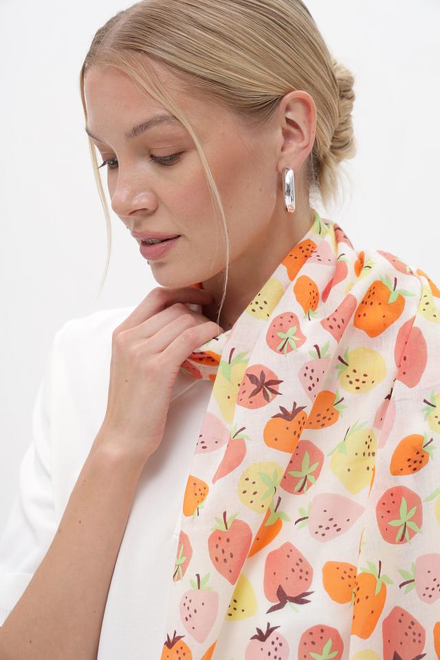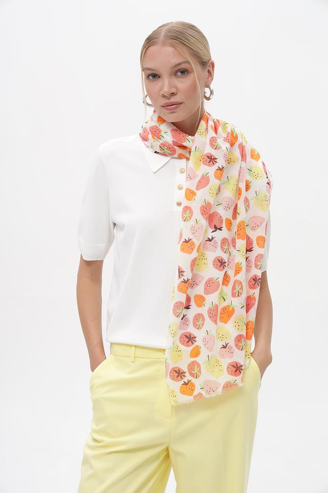 Шарф от бренда Fraas выполнен в нежной бежевой гамме и украшен красочным принтом с изображением фруктов – клубники, персиков и апельсинов.