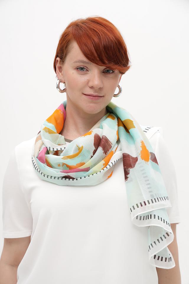Этот шарф от Fraas – идеальный аксессуар для создания яркого и запоминающегося образа. Шарф выполнен в светло-голубой цветовой гамме и украшен абстрактным рисунком, выполненным в оранжевых, коричневых и розовых тонах.