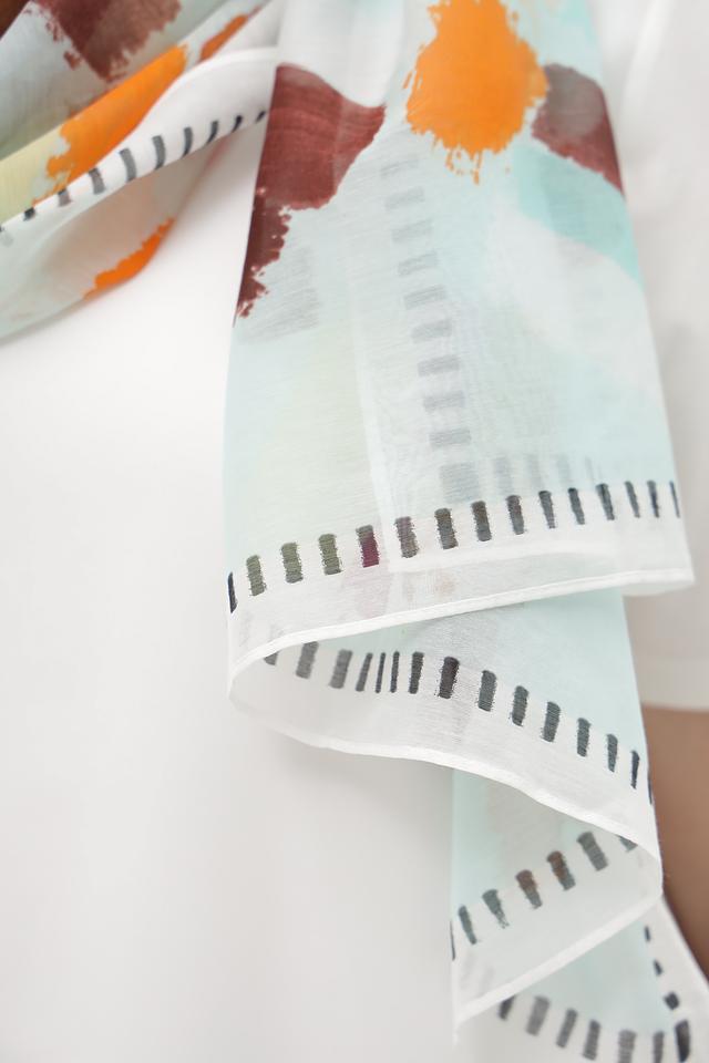 Шарф имеет прямоугольную форму и выполнен из сочетания хлопка (70%) и шелка (30%). Такое сочетание материалов обеспечивает приятные тактильные ощущения, мягкость и комфорт при ношении. Шарф легкий и воздушный, что делает его идеальным для любого времени года.