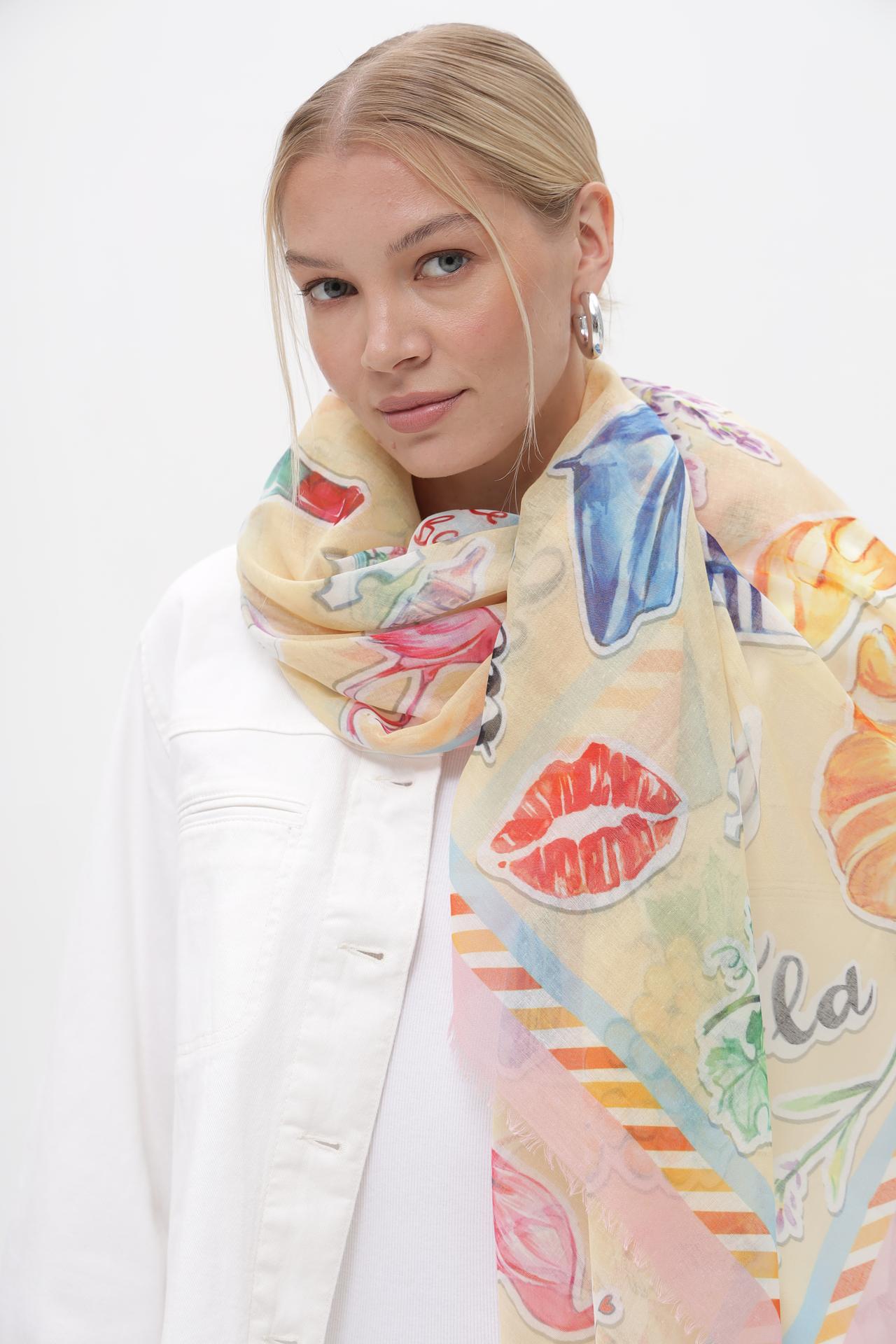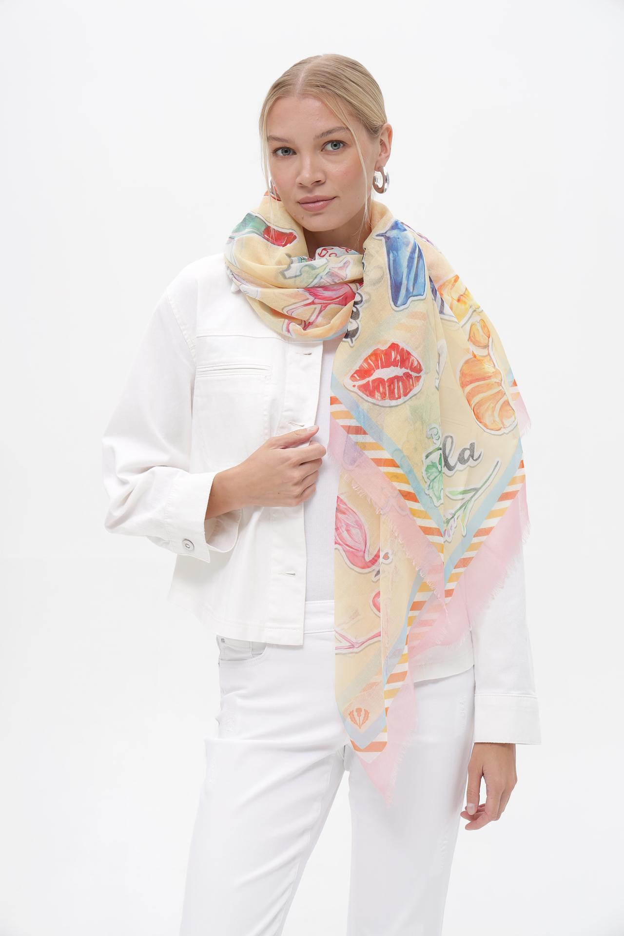 Легкий платок Fraas из 100% переработанного полиэстера – идеальный аксессуар для создания выразительного образа. Яркий разноцветный принт на основном желтом фоне, включающий изображения круассанов, поцелуев, фруктов и цветов, добавляет игривости и уникальности.
