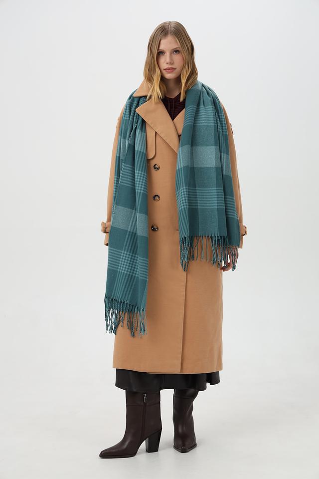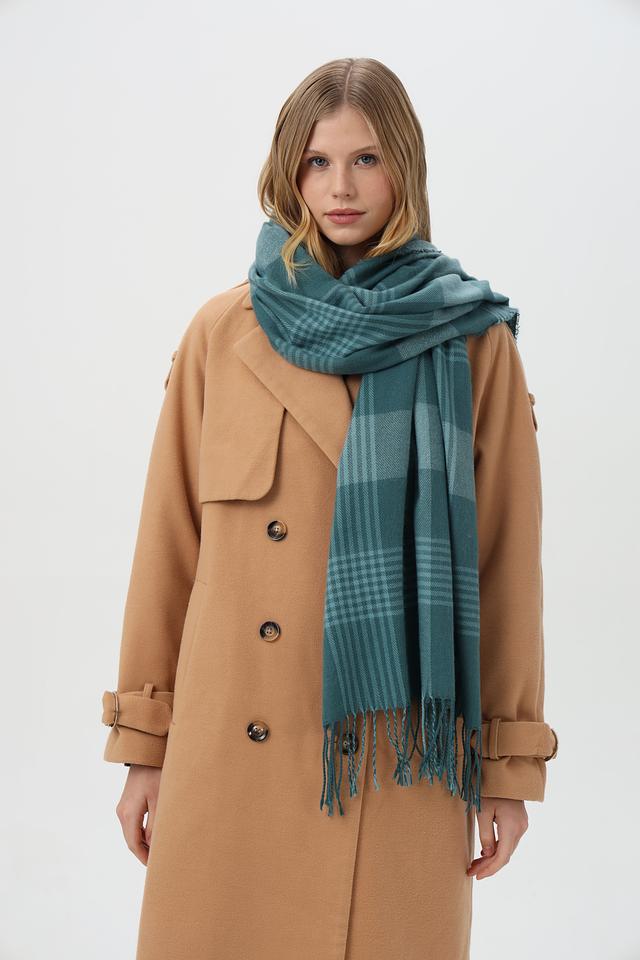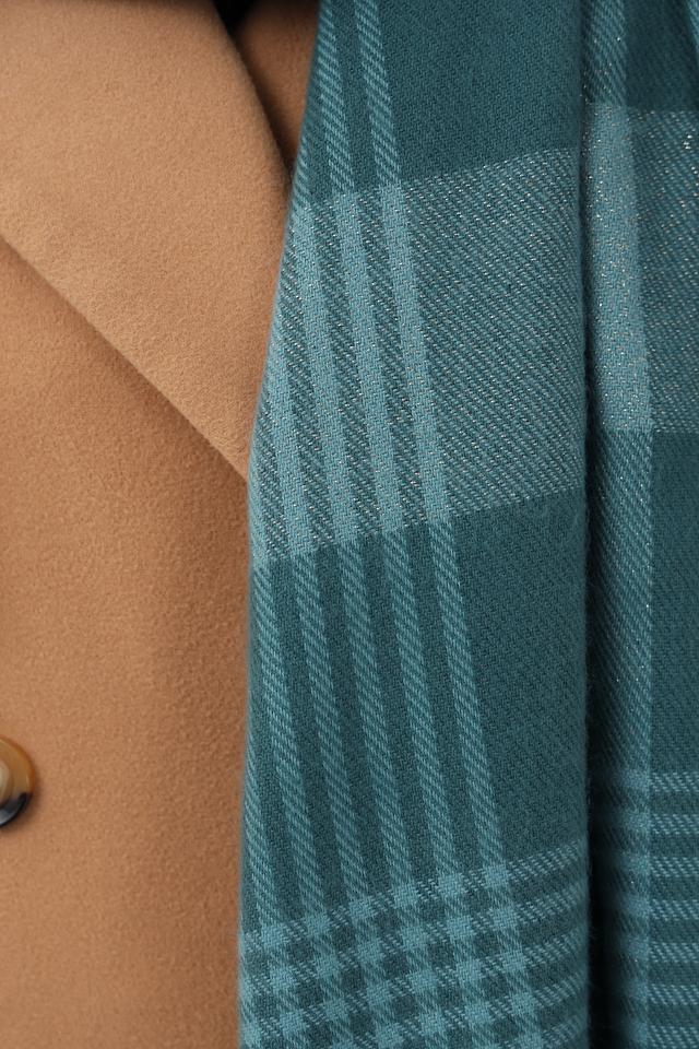 Шарф выполнен в бирюзовой цветовой гамме с сочетанием зеленых, бежевых и серых оттенков, создающих гармоничный рисунок. Прямоугольная форма шарфа позволяет носить его различными способами – обернуть вокруг шеи, накинуть на плечи или использовать как палантин.