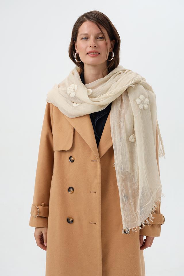 Шарф украшен объемными декоративными цветами, которые привносят в его дизайн нотку романтики. Легкая и воздушная ткань приятна на ощупь и комфортна в носке.