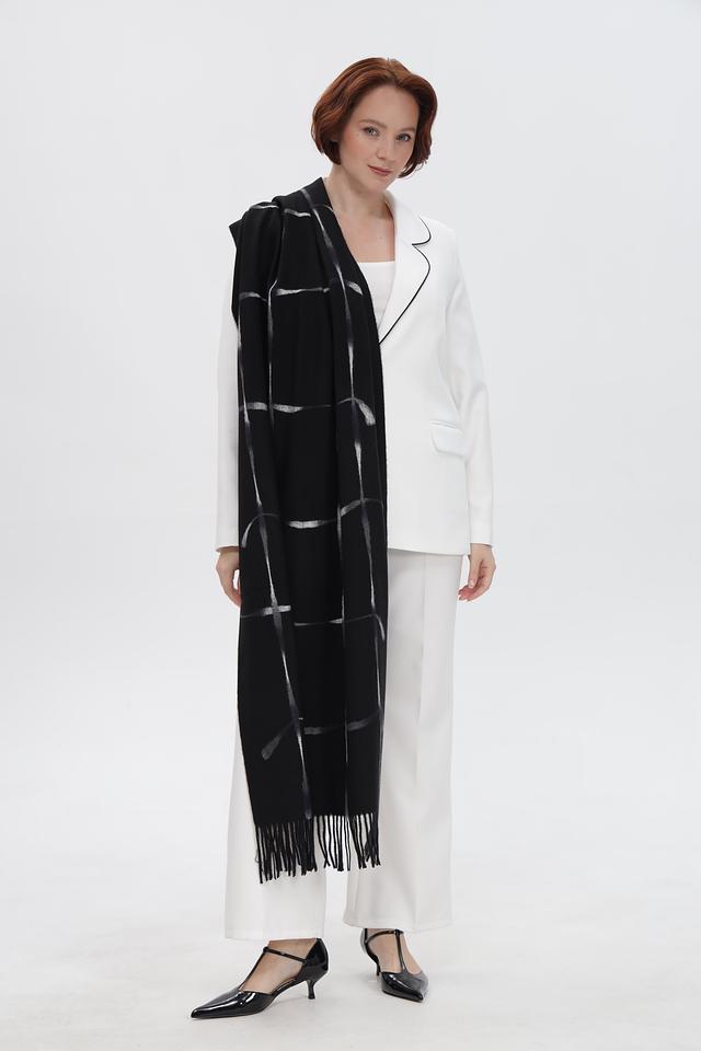 Этот элегантный шарф от бренда Fraas выполнен в классическом чёрном цвете и украшен стильным рисунком в клетку. Шарф имеет прямоугольную форму и дополнен бахромой по краям, что придает ему изысканный вид.