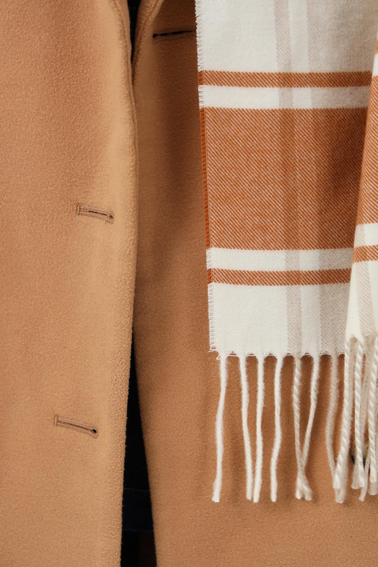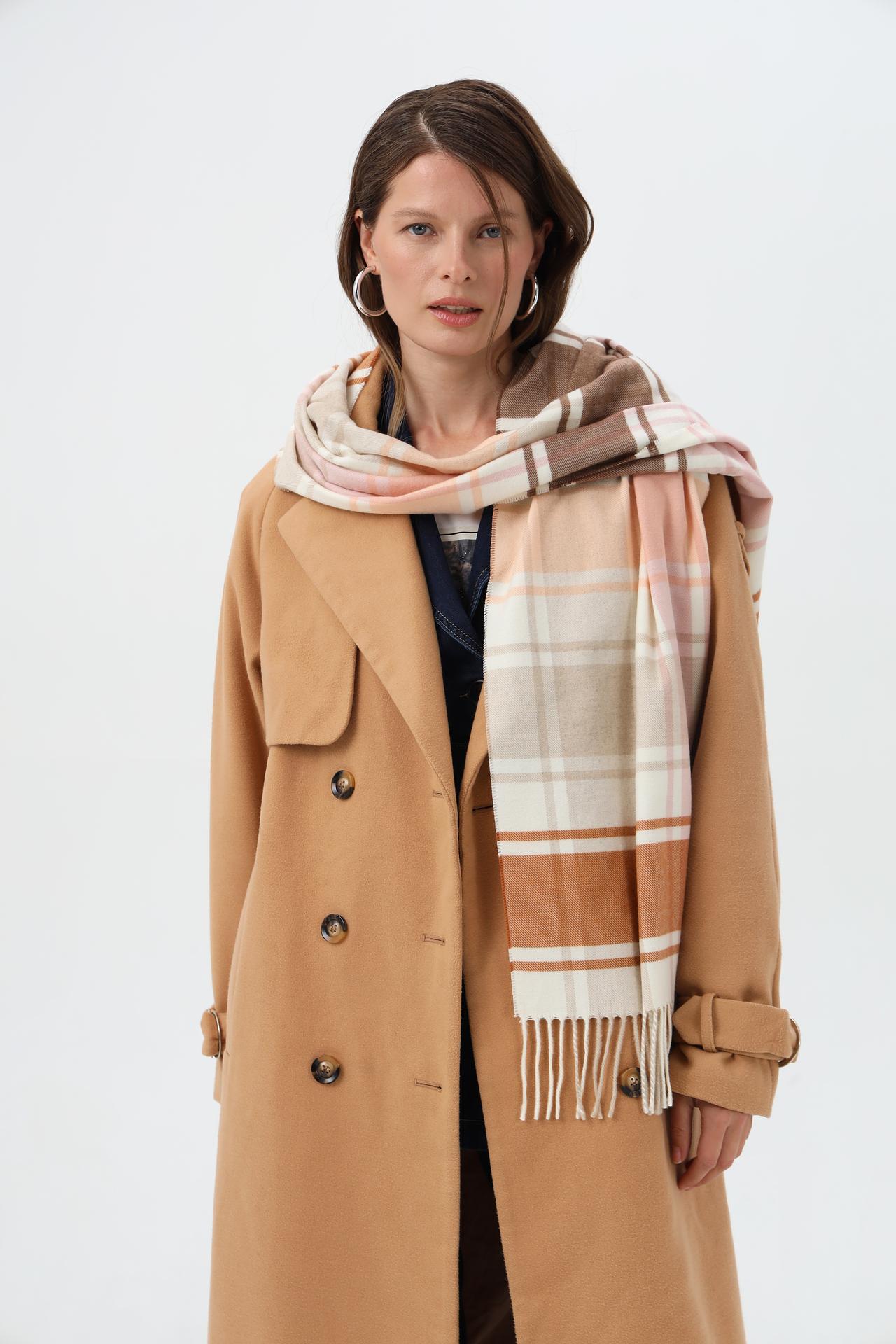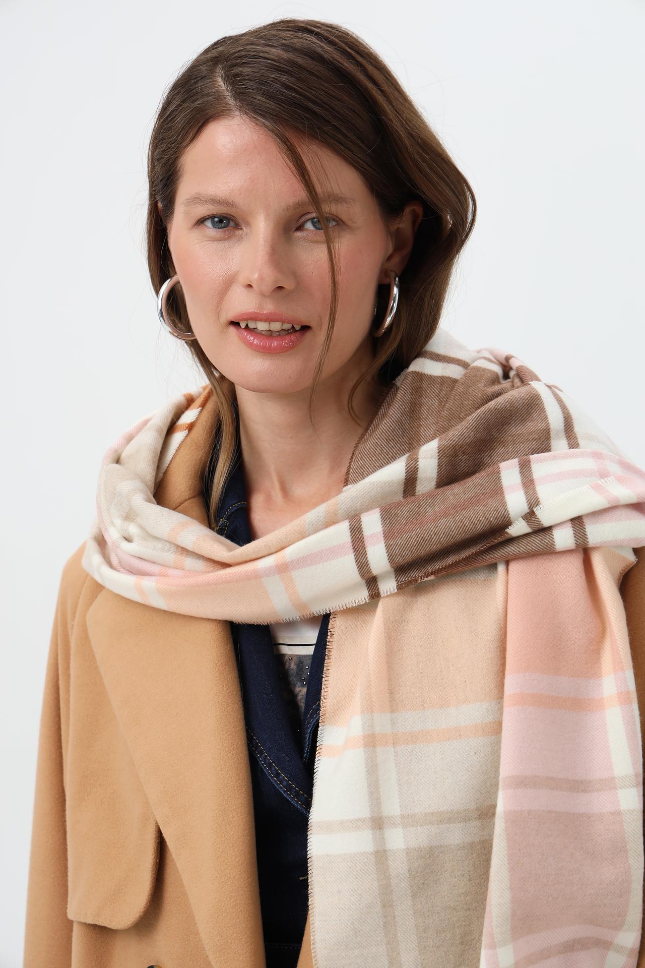 - Дизайн: Классическая клетка в сочетании нежных и теплых оттенков (бежевый, коричневый, розовый, белый) делает шарф универсальным и модным.