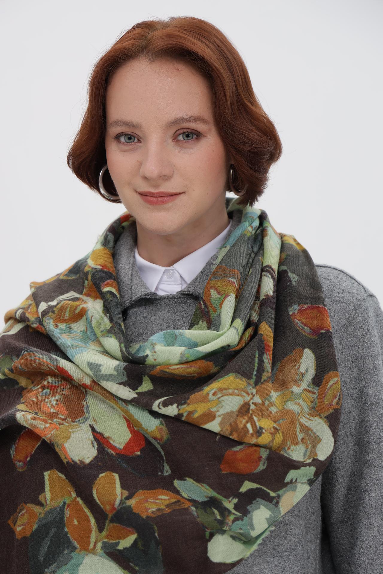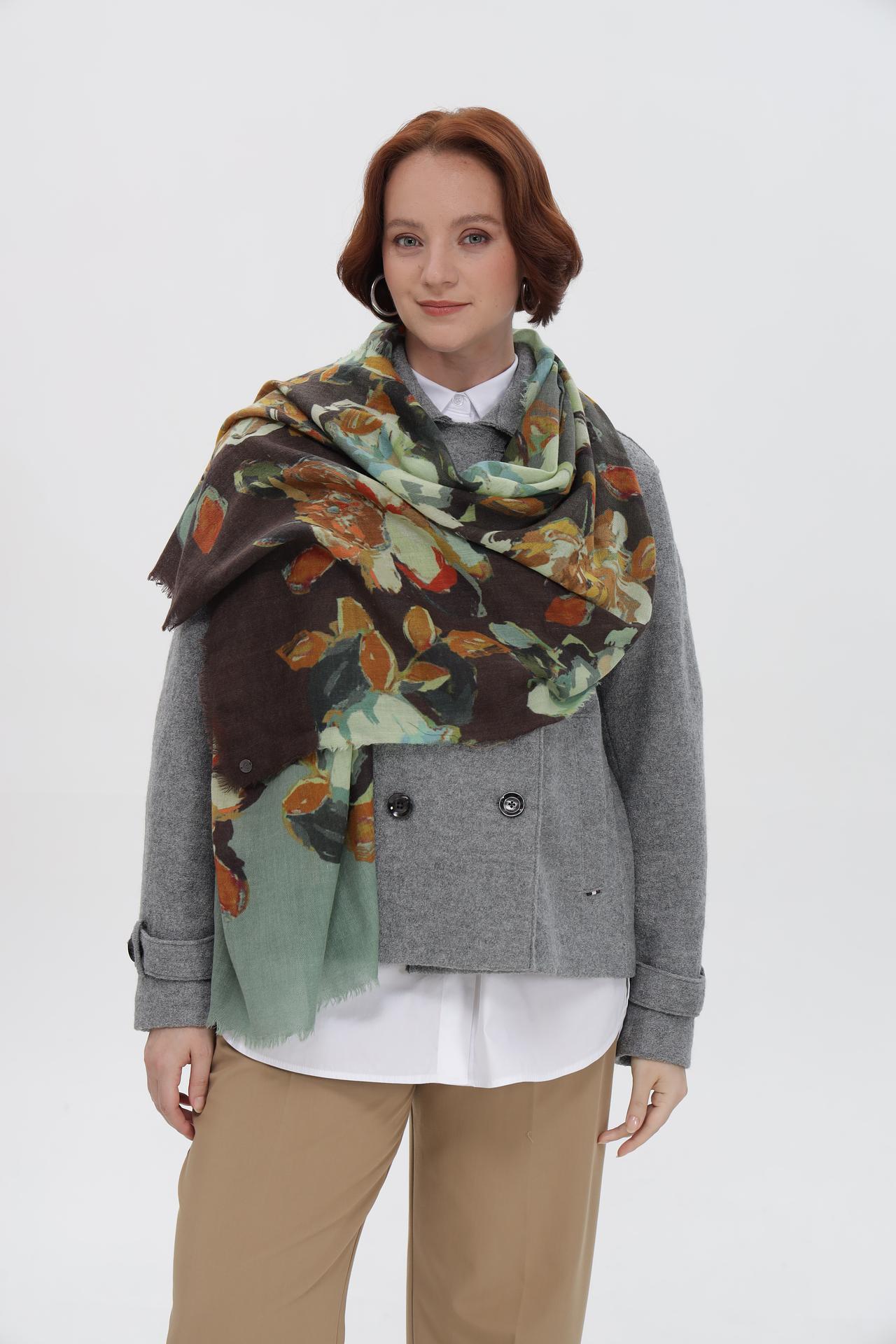 - Цветовая гамма: Многообразие оттенков. Шарф сочетает в себе коричневый, зеленый, оранжевый и бежевый цвета, что позволяет легко вписать его в различные цветовые решения гардероба.