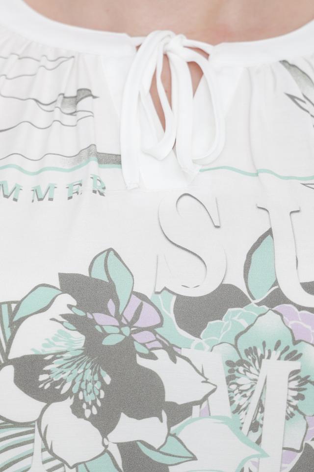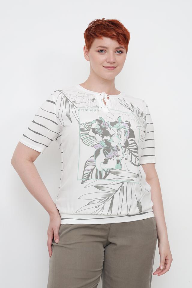 Основной цвет блузы – белый, а ярким акцентом является оригинальный принт с изображением тропических листьев и цветов в оттенках зеленого, серого и фиолетового. Короткие рукава и свободный крой обеспечивают комфорт в жаркую погоду.