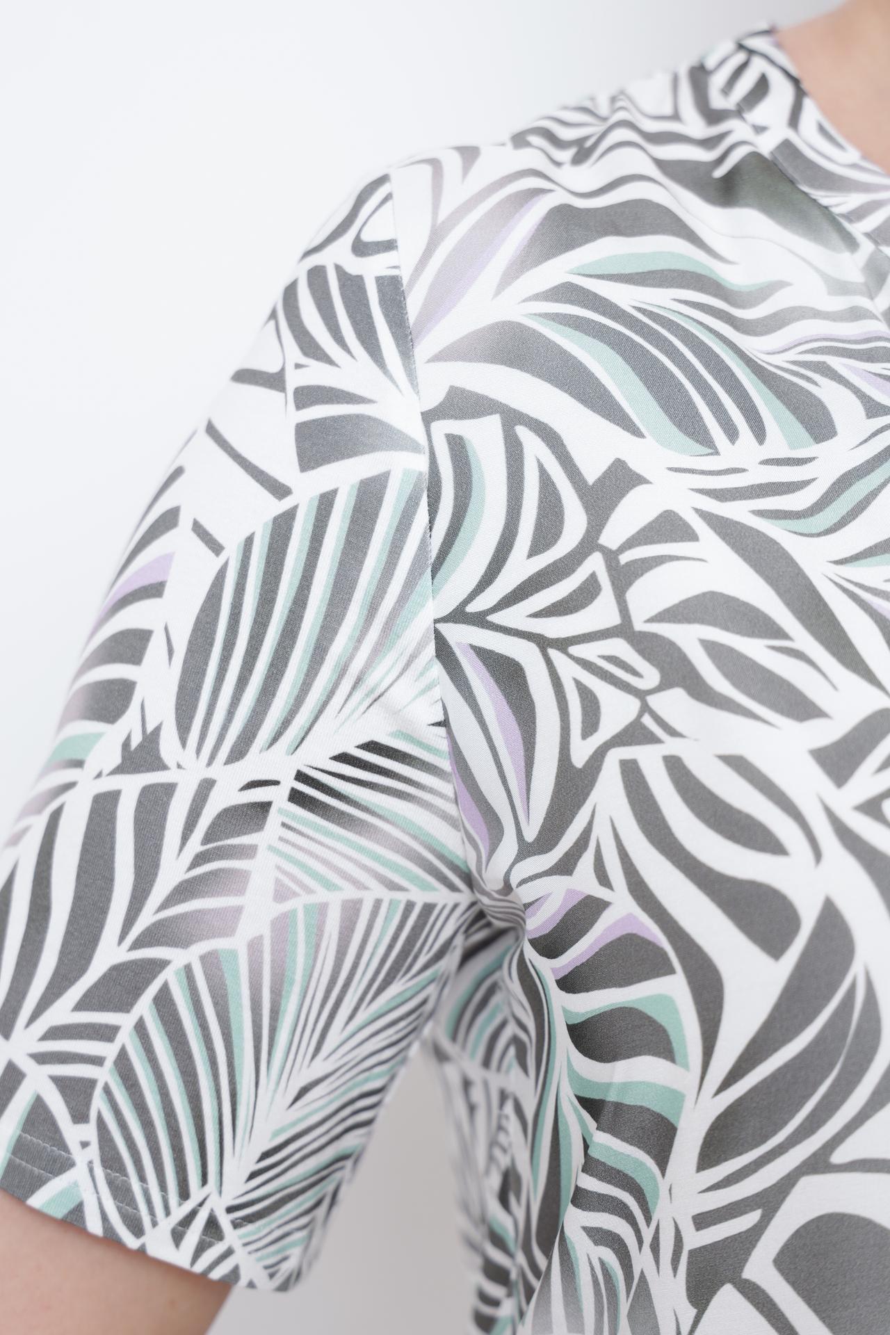 - Оригинальный дизайн. Принт с тропическими листьями придает образу свежесть и индивидуальность.