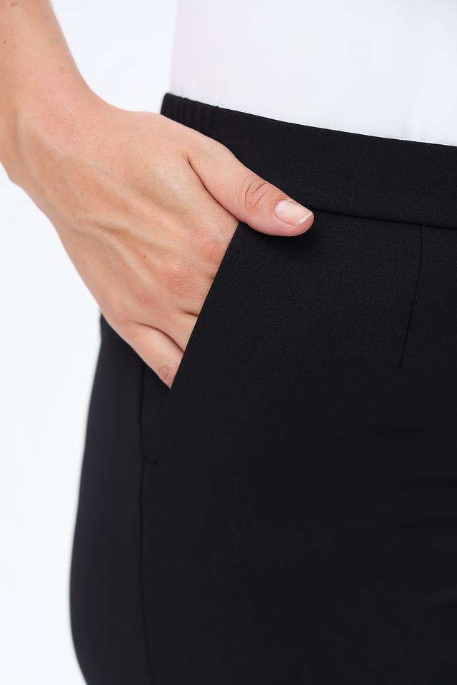 Брюки изготовлены из высококачественного полиэстера (87%) с добавлением эластана (13%), что обеспечивает приятные тактильные ощущения, хорошую посадку и устойчивость к сминанию. Эластичный пояс гарантирует удобство в носке.