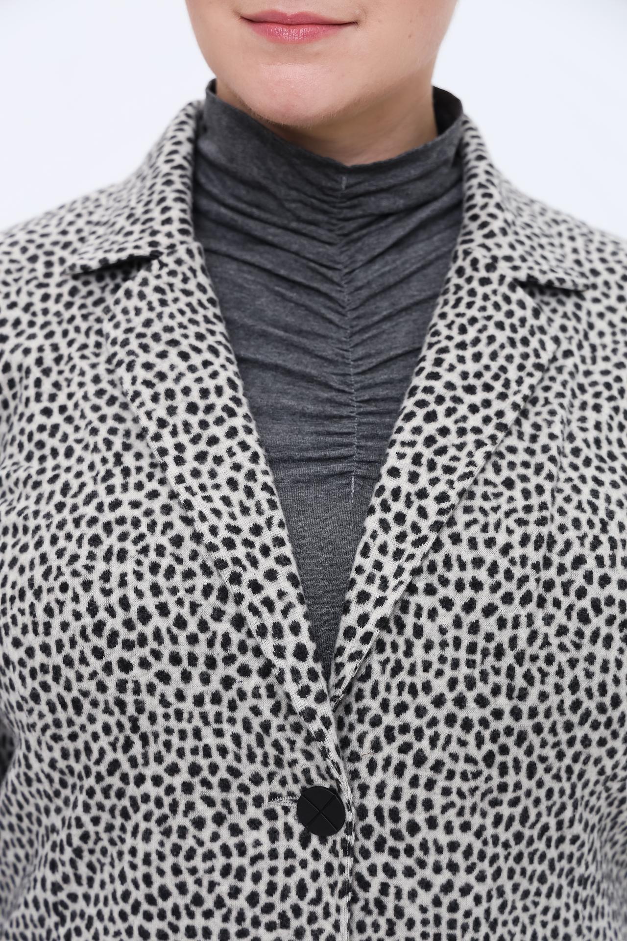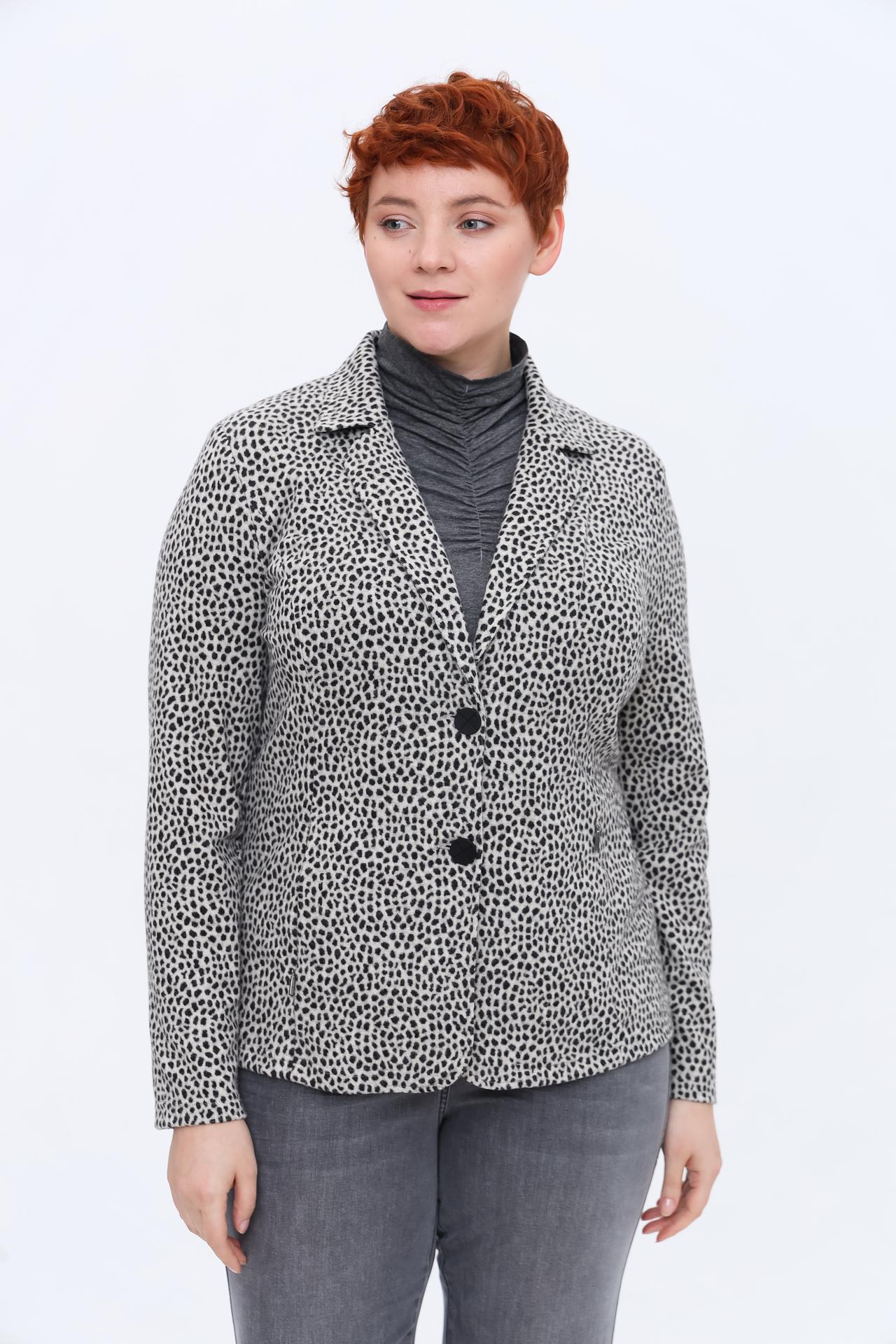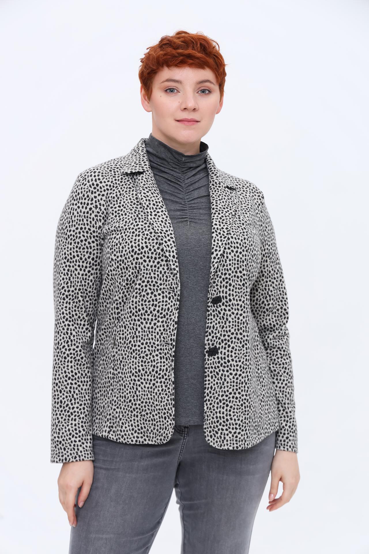 - Цветовая гамма: Сочетание серого и черного цветов в принте делает жакет универсальным, легко сочетаемым с базовыми вещами серого, черного и белого цветов.