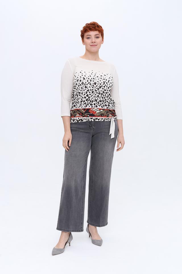 Лонгслив имеет кремовый цвет и украшен ярким леопардовым принтом в нижней части. Дополнительным акцентом служит декоративная лента с цветочным узором, которая подчеркивает талию и придает образу женственность.