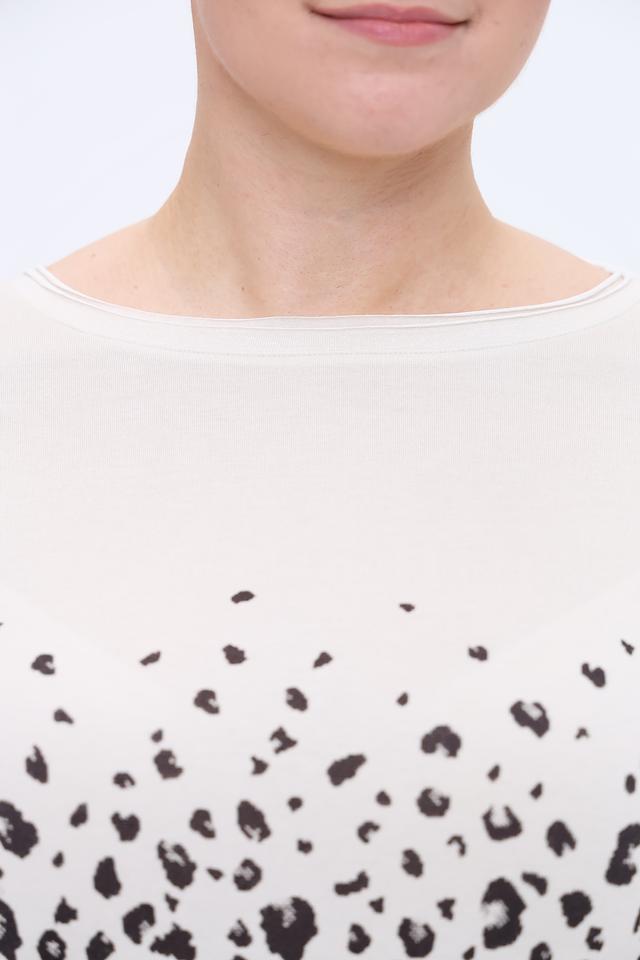 Женский лонгслив Frank Walder кремового цвета с оригинальным леопардовым принтом и декоративной лентой с цветочным узором. Модель выполнена из мягкой вискозы с добавлением эластана, обеспечивающей комфорт и свободу движений. Состав: вискоза 96%, эластан 4%