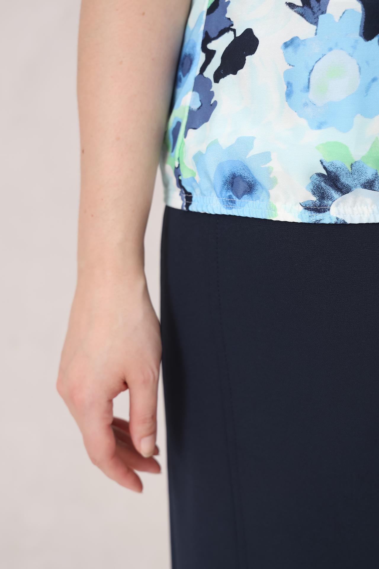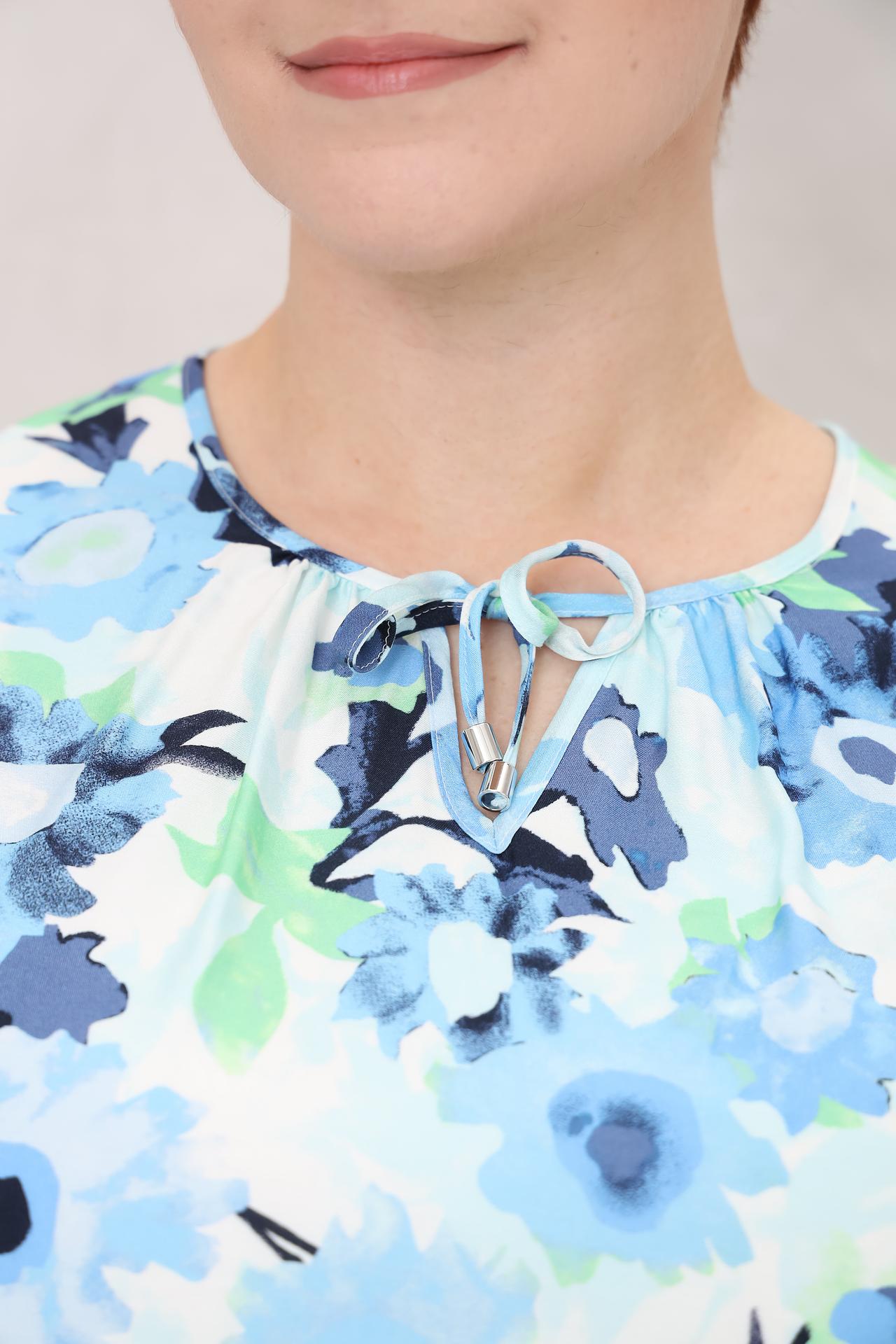 - Стильный цветочный принт: Яркий и выразительный принт в сине-голубых тонах с акцентами зеленого придает блузе особую изюминку. Этот женственный узор легко сочетается с однотонными юбками, брюками или джинсами, создавая актуальный образ.