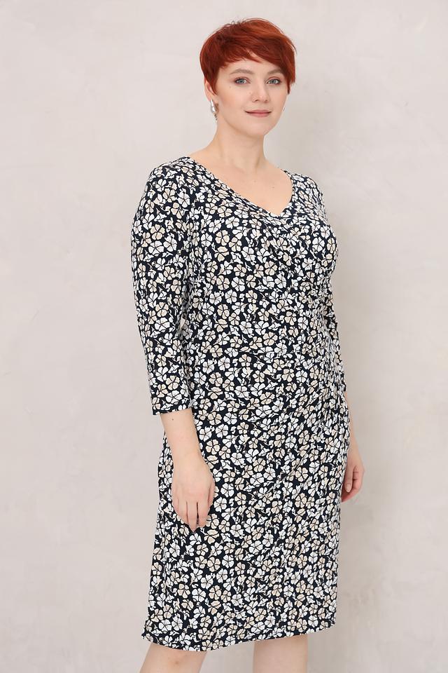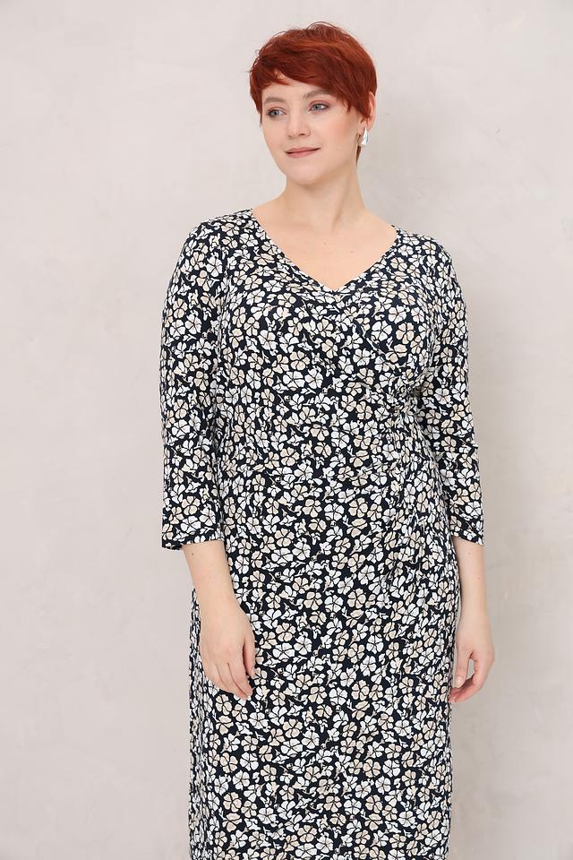 Платье имеет приталенный силуэт, который подчеркивает достоинства фигуры. V-образный вырез горловины и рукава длиной три четверти придают образу изящество и женственность. По всей поверхности платья расположен мелкий цветочный принт, который добавляет романтичности.