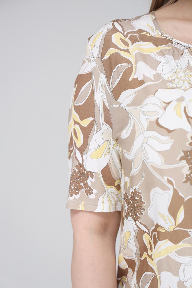 Основной цвет блузы – бежевый, а яркий цветочный принт, состоящий из белых, желтых и коричневых оттенков, придает ей особую изысканность и женственность.