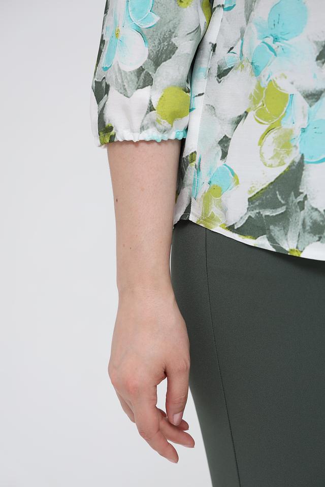 Женская блуза Frank Walder светло-зелёного цвета с ярким цветочным принтом. Модель выполнена из лёгкой вискозы, имеет V-образный вырез и рукава 3/4 с небольшим буфом. Состав: вискоза 100%