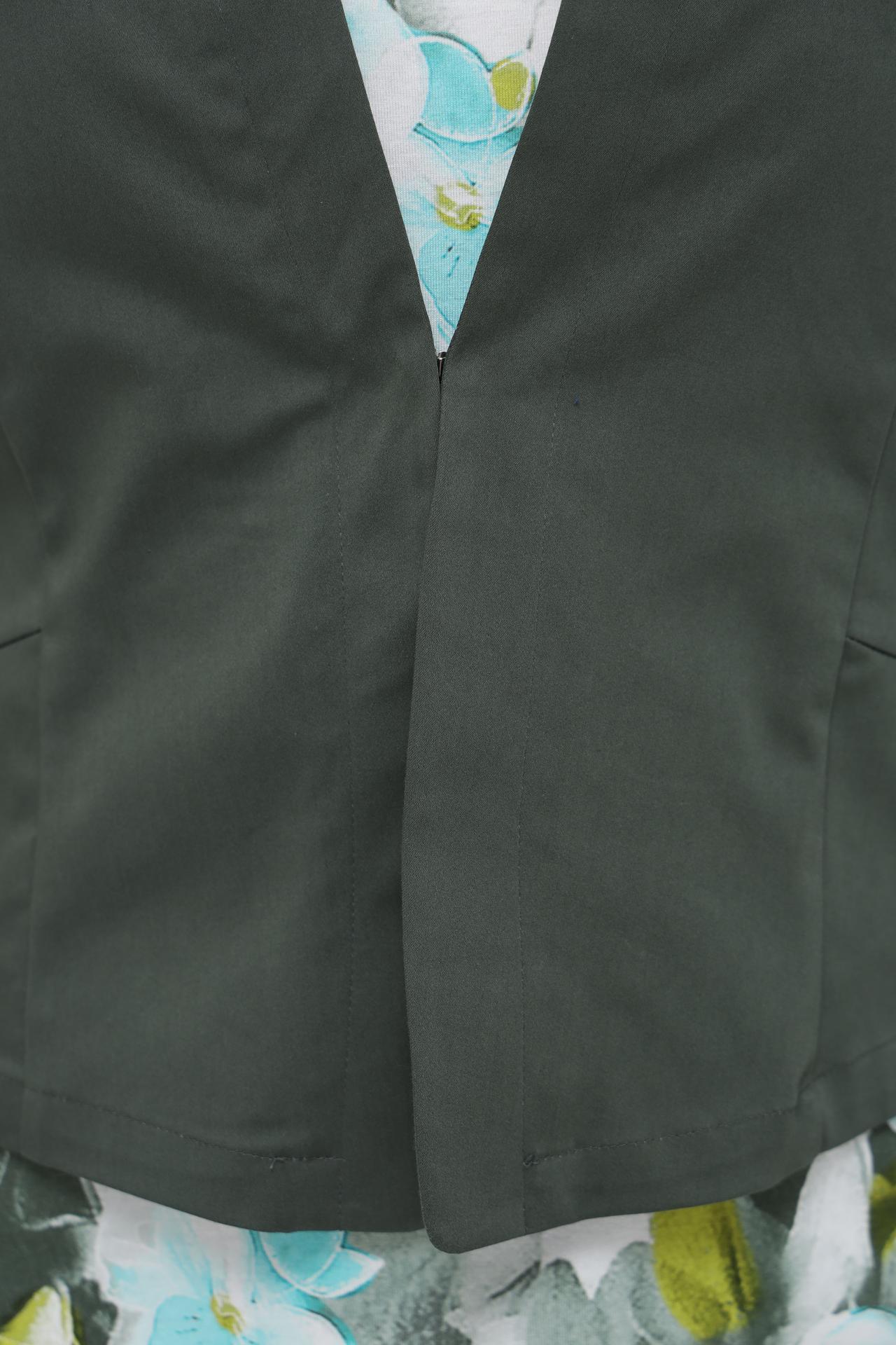 - Элегантный дизайн. Модель отличается укороченным силуэтом и свободным кроем без застежки, что создает легкий и современный вид. Отсутствие лацканов и воротника формирует изящный V-образный вырез, визуально удлиняющий шею.