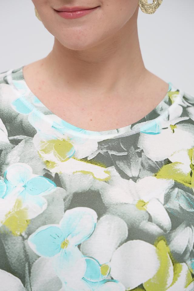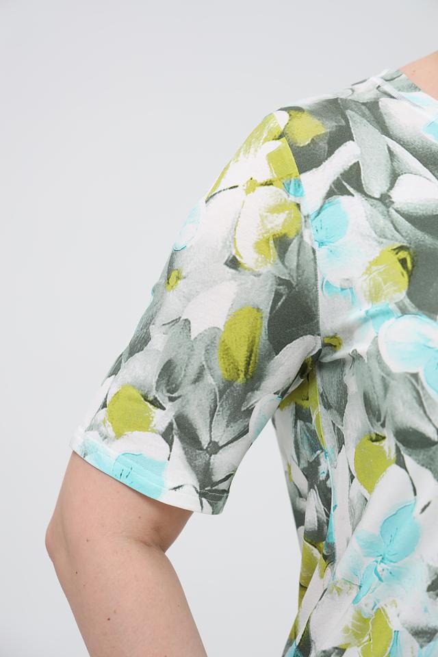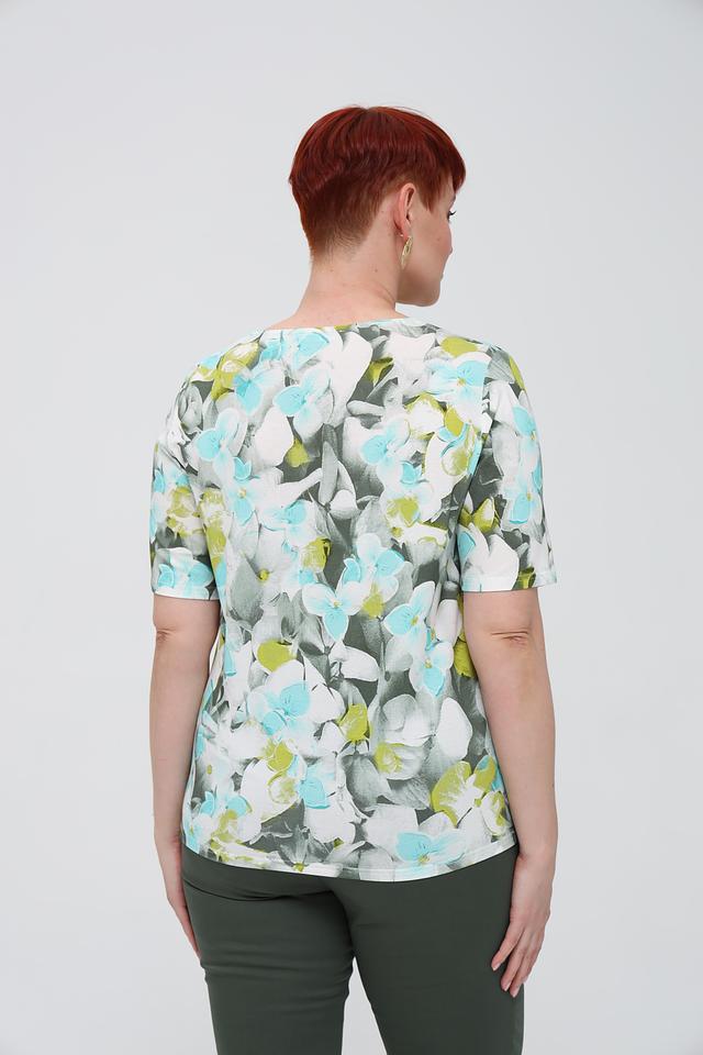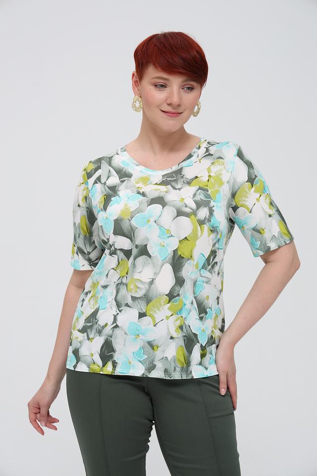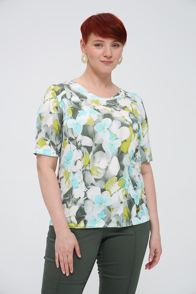 Особенностью данной модели является яркий цветочный принт, который добавляет свежести и женственности. Футболка имеет круглый вырез горловины и короткие рукава, что делает ее идеальной для теплой погоды.