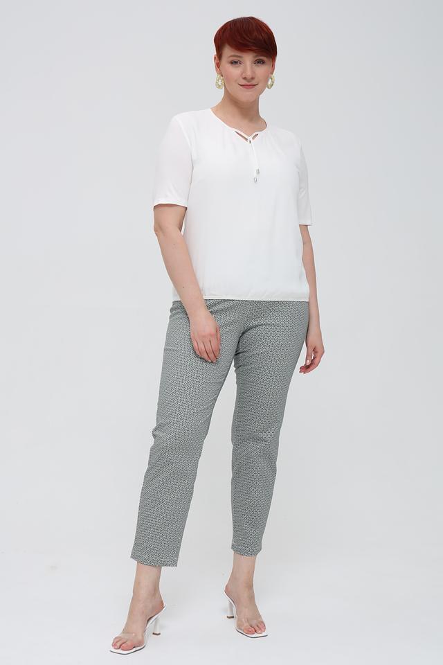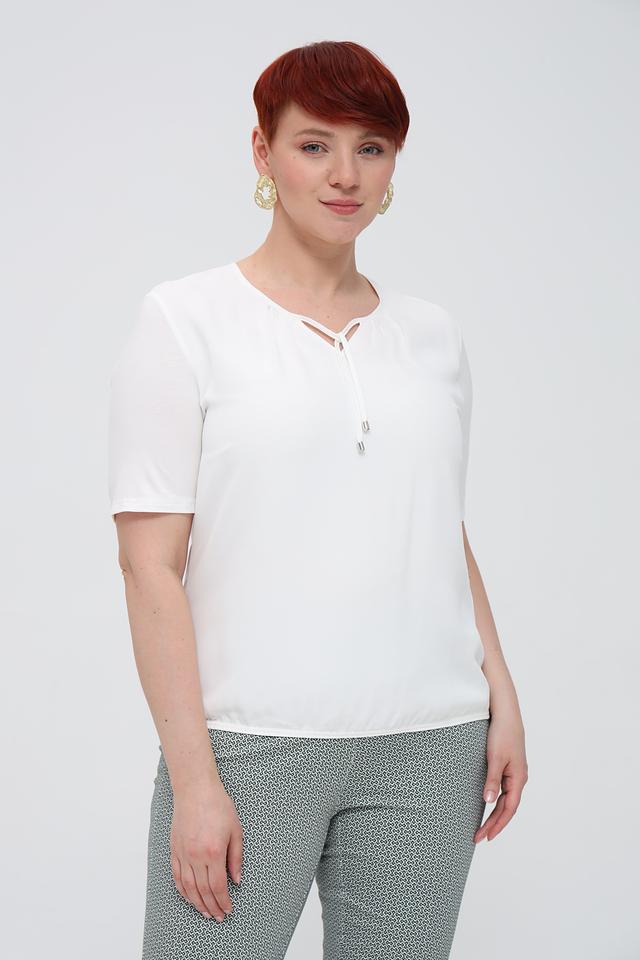 Блуза имеет короткие рукава и V-образный вырез, который украшен тонкими завязками, добавляющими образу игривости и женственности. Простой, но элегантный дизайн позволяет сочетать эту блузу с различными предметами гардероба – от классических брюк до юбок.