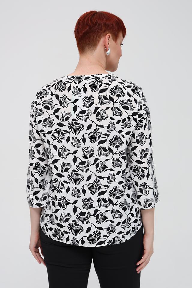 Блуза имеет свободный крой и короткие рукава, что обеспечивает свободу движений. Особенностью модели является яркий цветочный принт в черном цвете на белом фоне, а также контрастная розовая отделка по вырезу горловины и центру полочки.