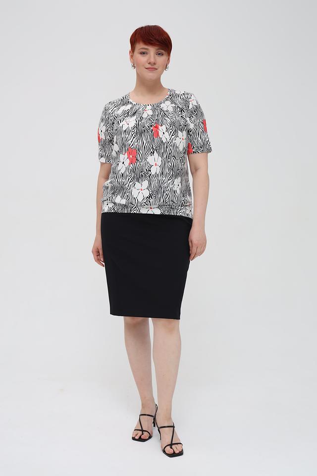 Модель имеет свободный крой, который не сковывает движений и обеспечивает комфорт в течение всего дня. Короткие рукава делают блузу подходящей для теплой погоды. Круглый вырез горловины подчеркивает линию шеи и декольте.