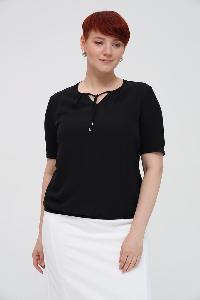 Модель имеет короткие рукава и округлый вырез горловины, украшенный тонкими завязками, которые добавляют образу женственности и изысканности. Блуза выполнена из высококачественной вискозы с добавлением эластана, что обеспечивает приятные тактильные ощущения и комфорт при носке.