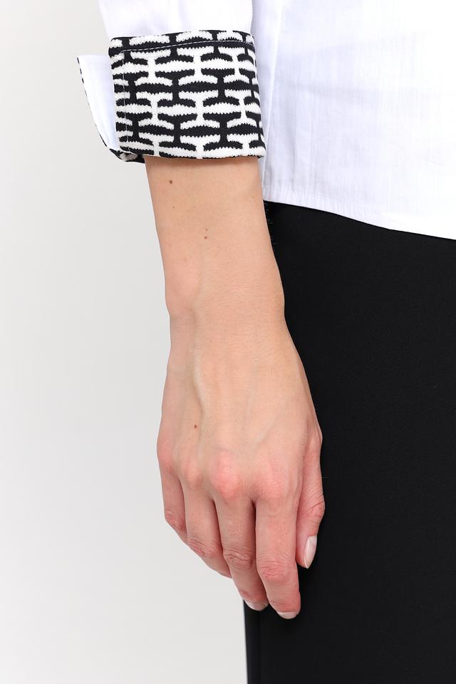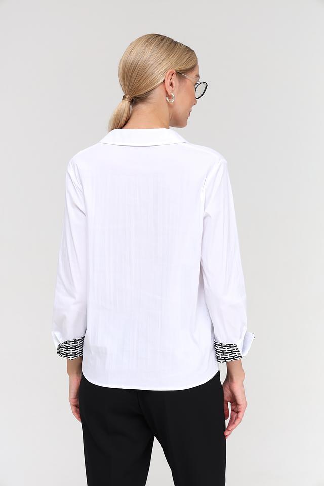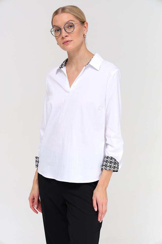 Белая блуза Frank Walder из хлопка с принтом на манжетах и воротнике. Модель выполнена из смесового состава с добавлением полиамида и эластана для комфорта и сохранения формы. Состав: хлопок 76%, полиамид 22%, эластан 2%