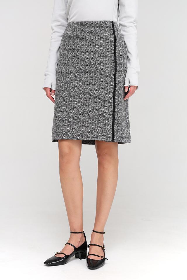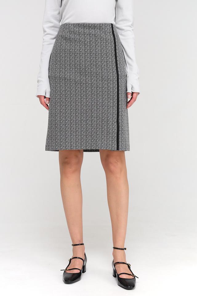Юбка Frank Walder серого цвета с геометрическим принтом и черной полосой – стильное и комфортное решение для создания элегантного образа. Модель выполнена из качественного смесового материала с добавлением эластана, обеспечивающего удобную посадку. Состав: полиэстер 56%, хлопок 43%, эластан 1%