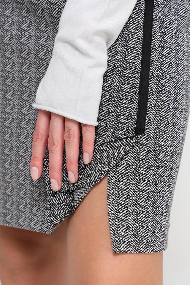 Юбка имеет классический крой и длину до колена. Её отличает оригинальный клетчатый принт в сочетании с контрастной черной полосой по боковой части. Эластичный пояс обеспечивает удобство и позволяет юбке идеально сидеть на талии.