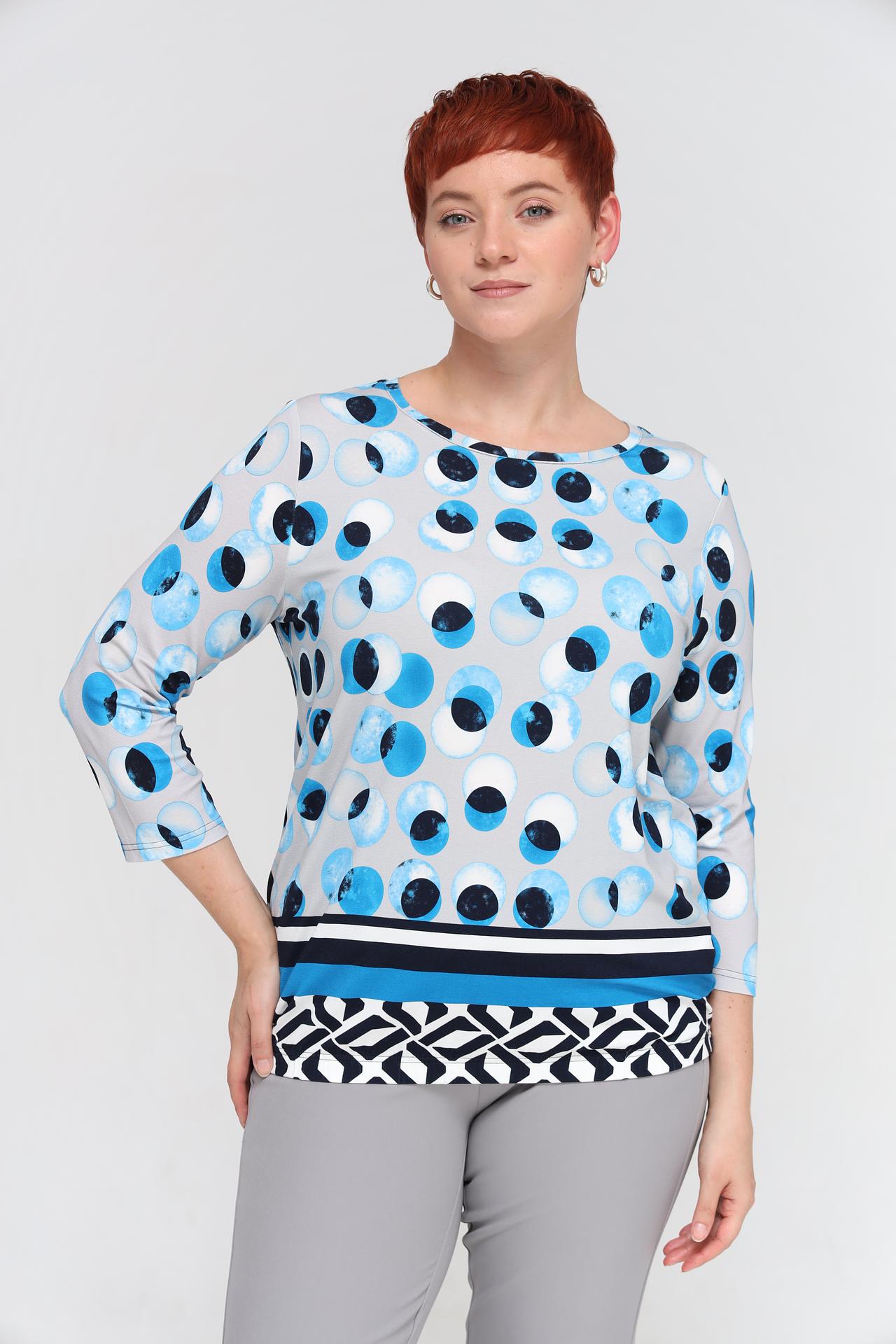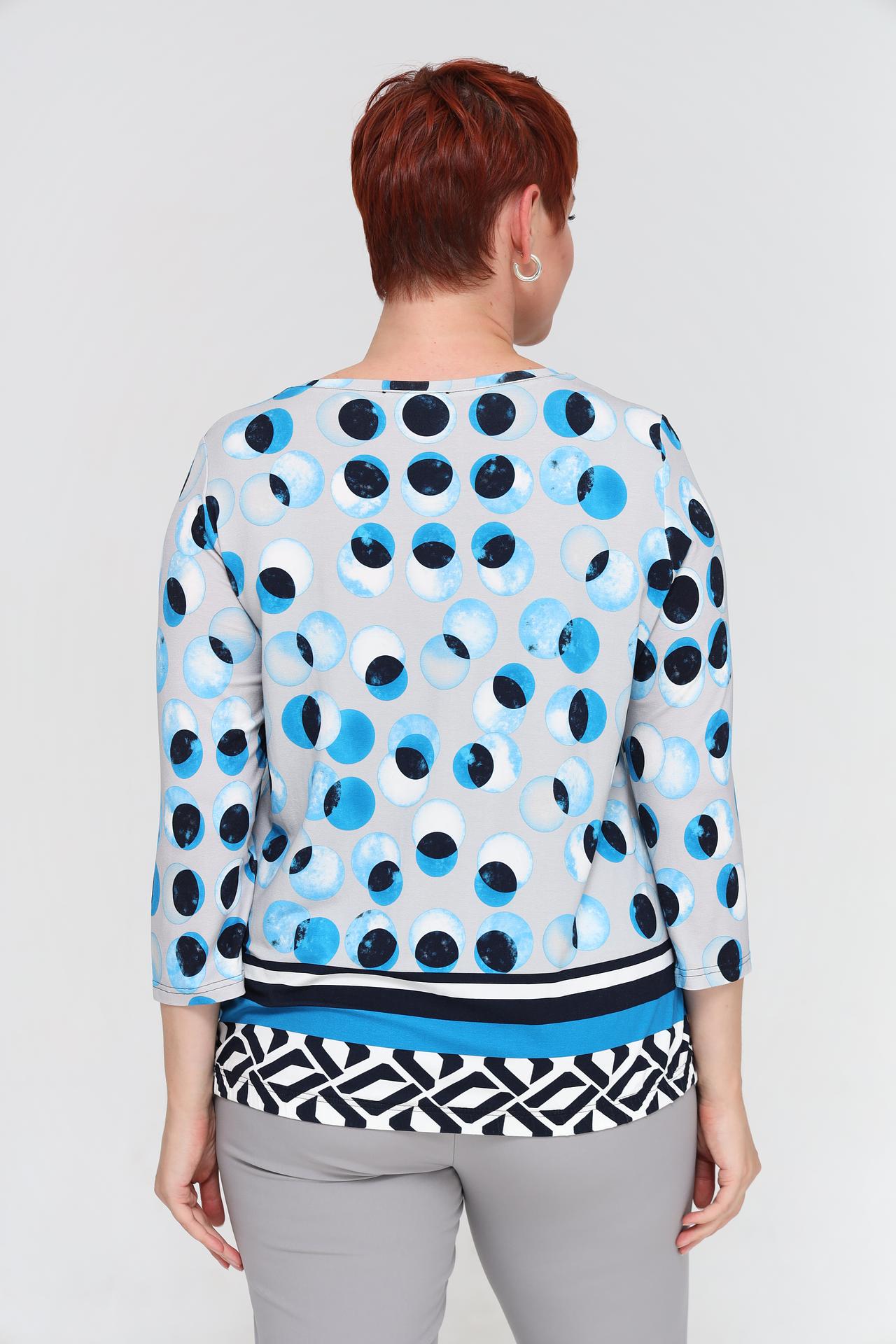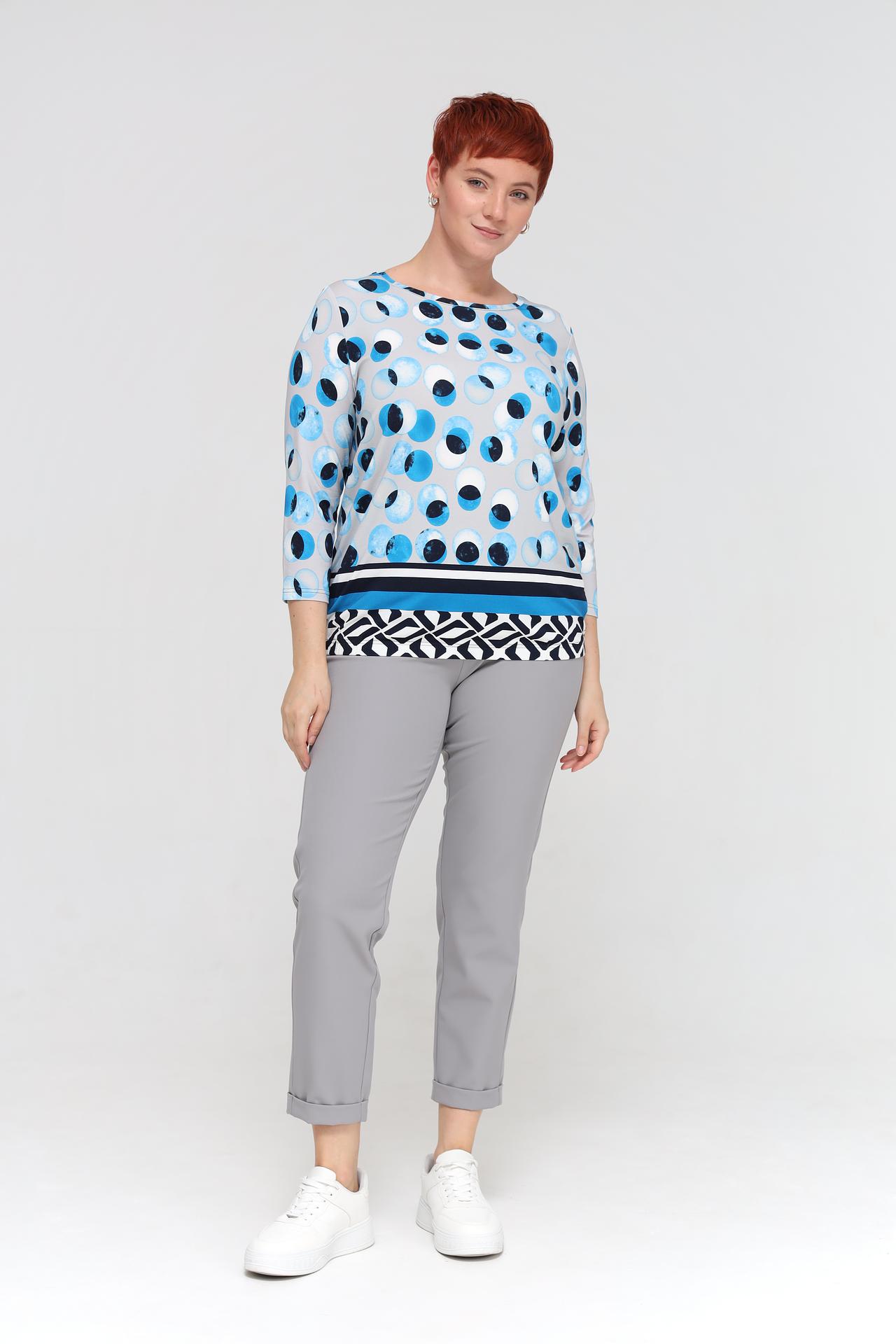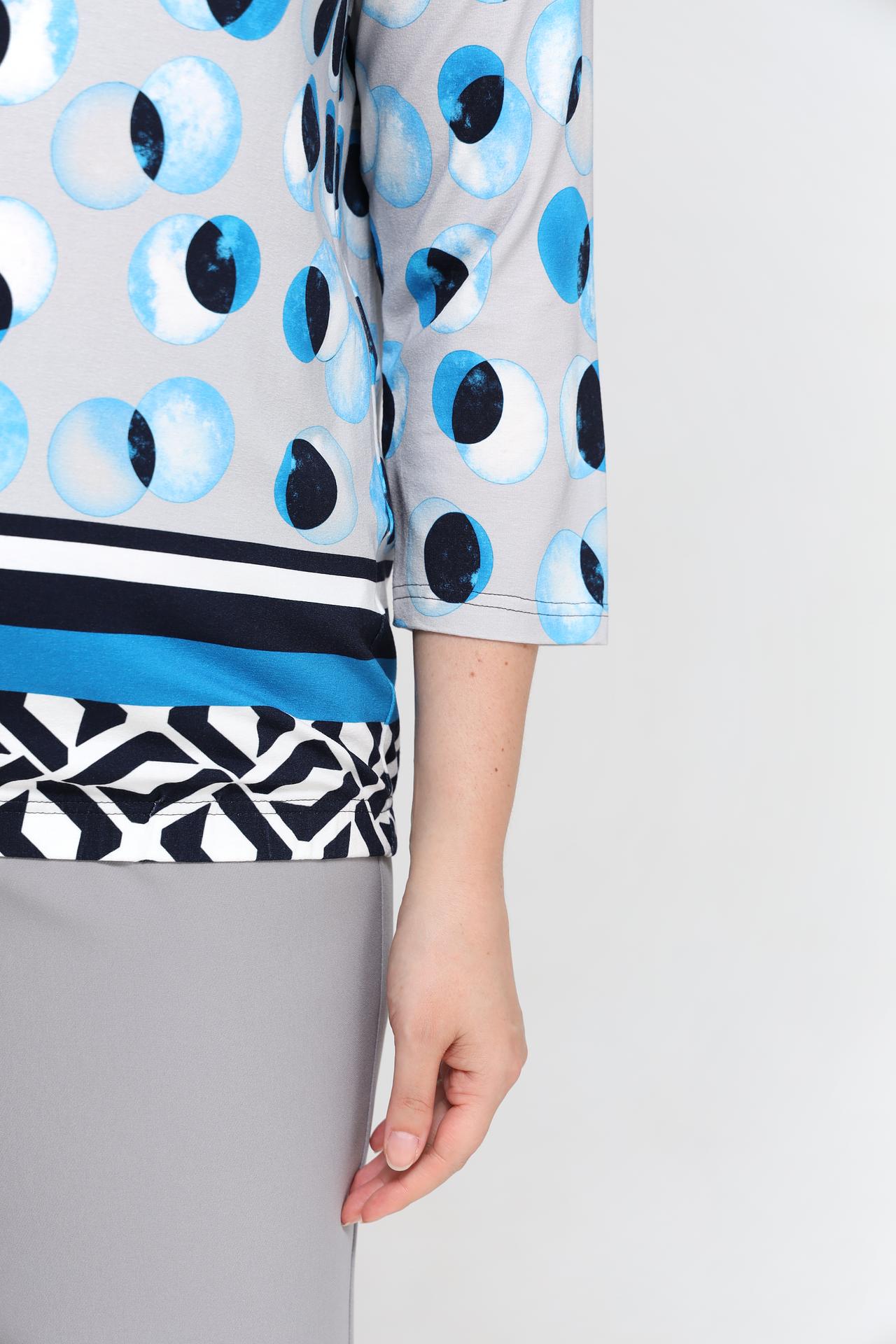- Принт: Яркий и современный принт в виде кругов добавит акцент в ваш образ. Он выполнен в сочетании голубых, синих и белых оттенков на сером фоне.