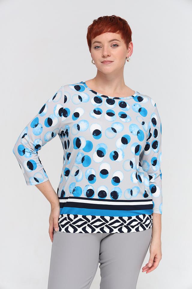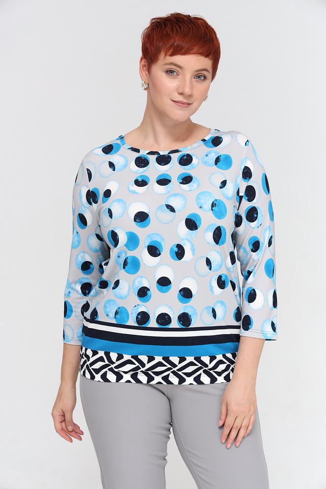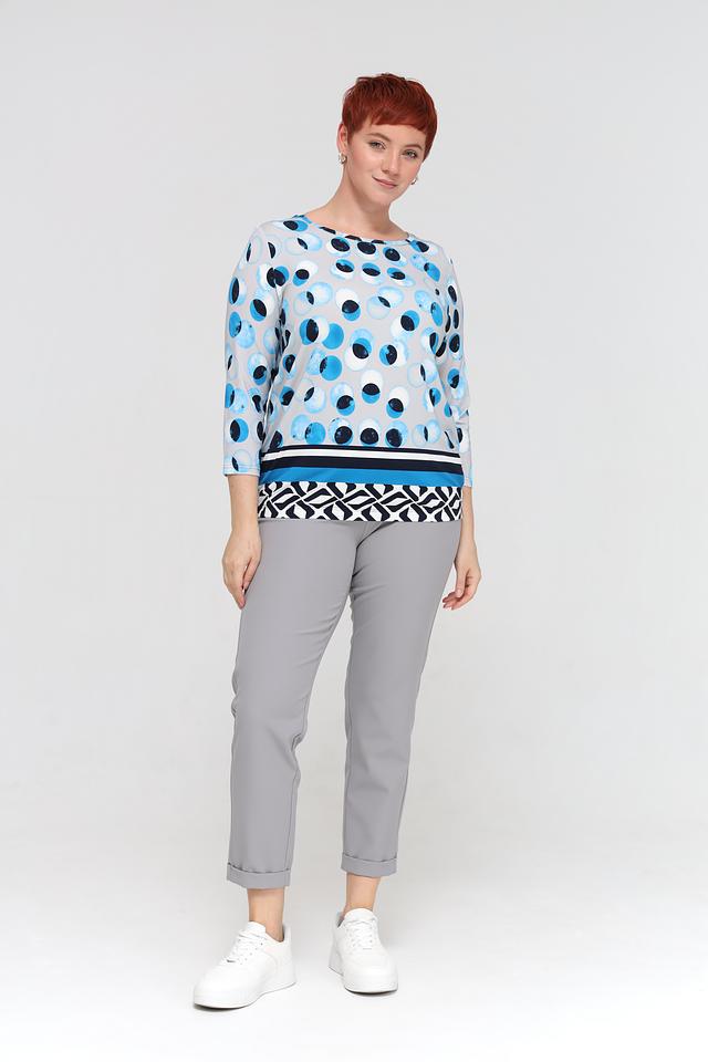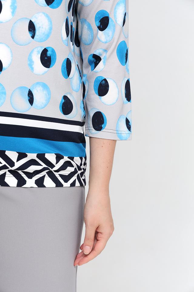 Женская футболка Frank Walder светло-серого цвета с ярким принтом в виде горошка и геометрическим узором. Модель выполнена из мягкой вискозы с добавлением эластана, обеспечивающего комфортную посадку. Состав: вискоза 96%, эластан 4%