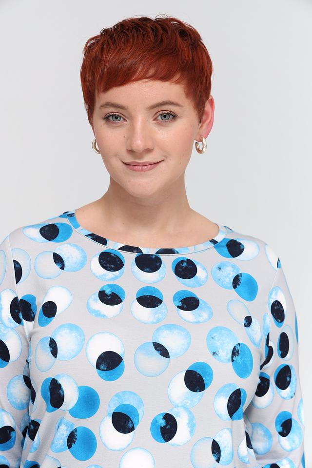Принт состоит из крупных голубых и темно-синих горошин, расположенных на светло-сером фоне, а нижняя часть футболки украшена геометрическим узором в синих и белых тонах. Такое сочетание цветов и узоров делает эту футболку по-настоящему уникальной и привлекательной.