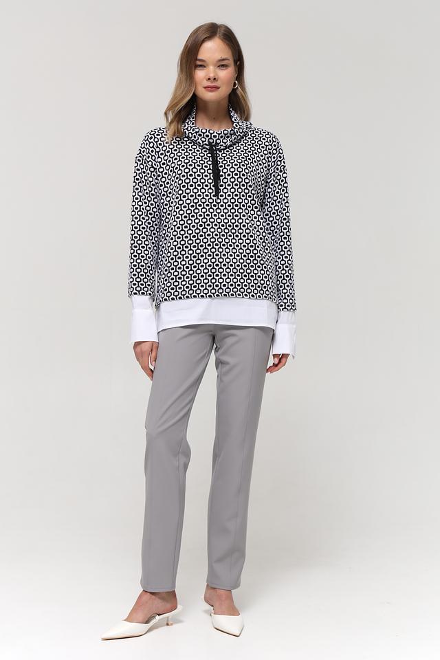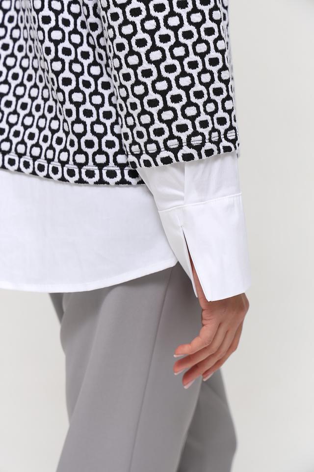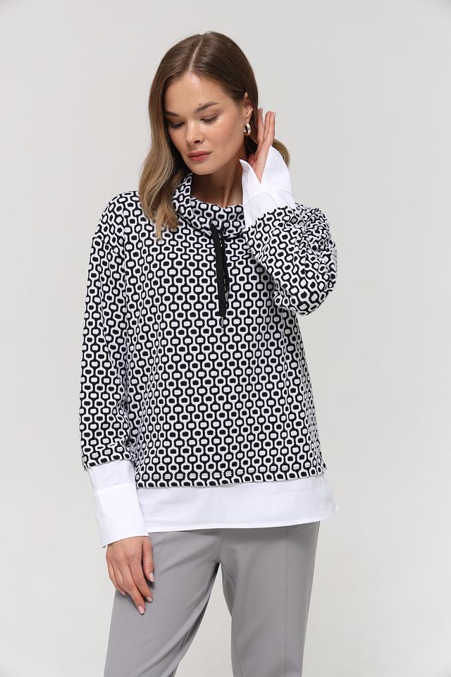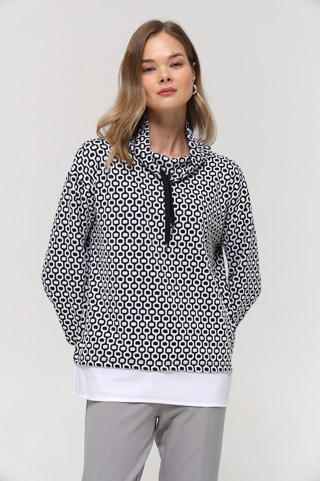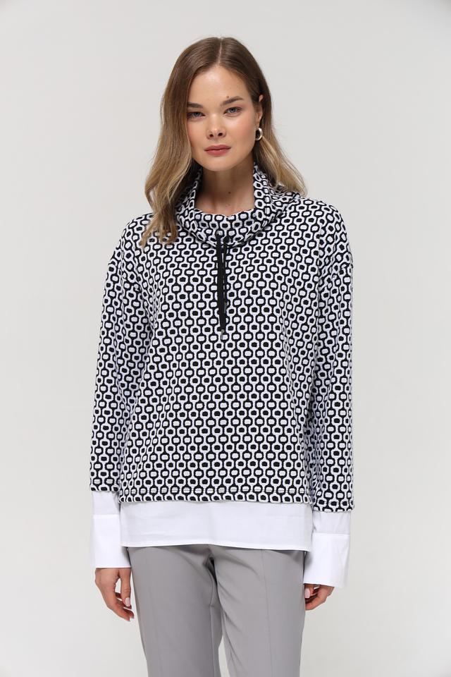 Женский пуловер Frank Walder чёрно-белого цвета с геометрическим принтом и высоким воротником-стойкой. Модель выполнена из мягкого и приятного к телу сочетания полиэстера, хлопка и эластана, обеспечивающего комфорт и свободу движений. Состав: полиэстер 51%, хлопок 46%, эластан 3%