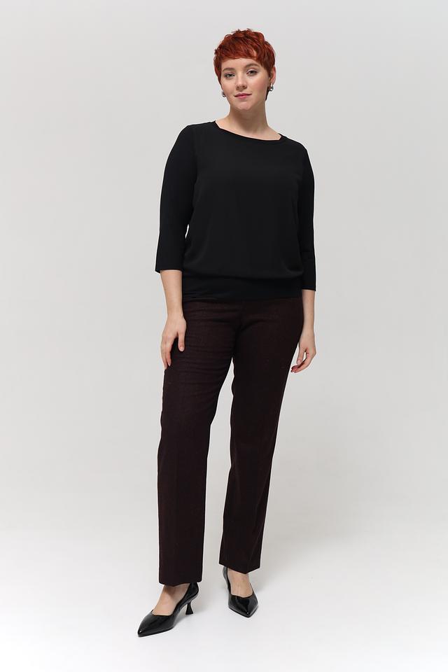 Блуза имеет классический крой с округлым вырезом горловины и рукавом три четверти. Благодаря лаконичному дизайну, она легко сочетается с различными элементами гардероба – от классических брюк до юбок.