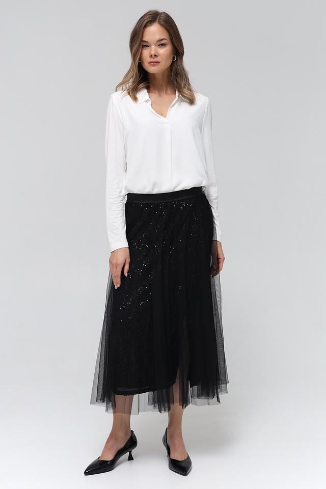 Блуза имеет прямой крой, длинные рукава и аккуратный воротник. Слегка заниженная линия плеч придает ей более расслабленный и современный вид. Небольшая сборка на груди создает легкую драпировку, добавляя блузе женственности.