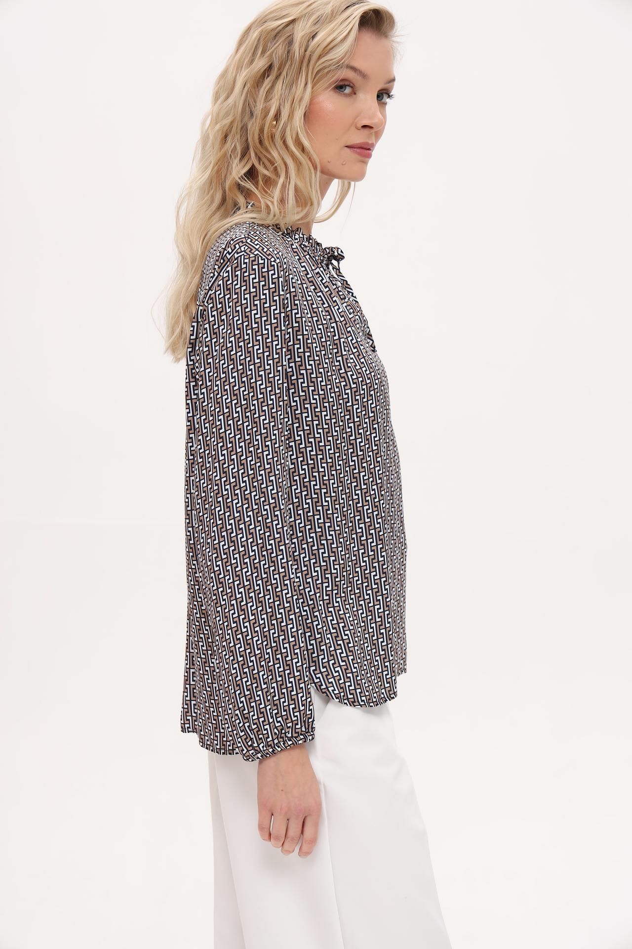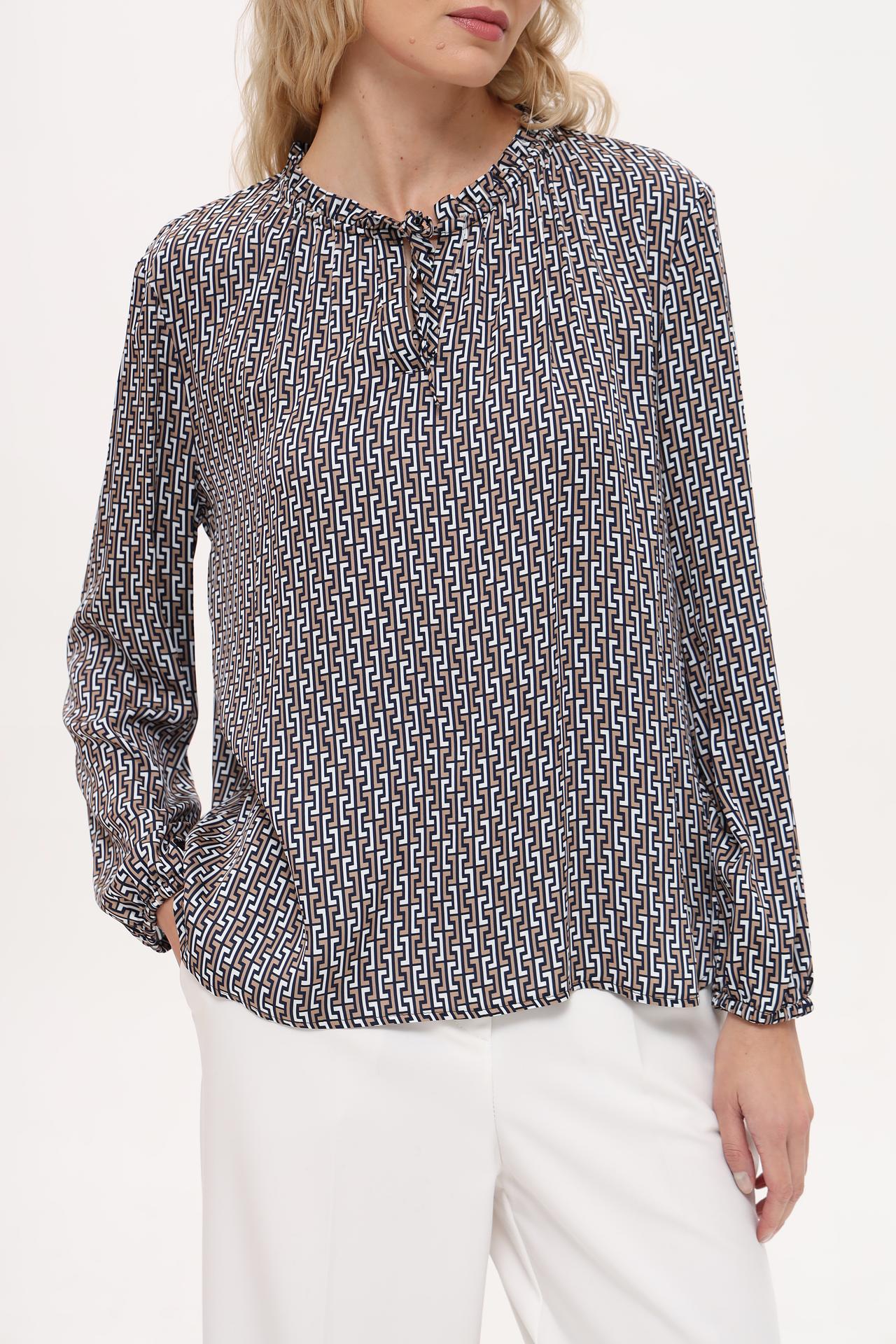- Дизайн: Геометрический принт добавляет оригинальности и делает блузу актуальной и современной.