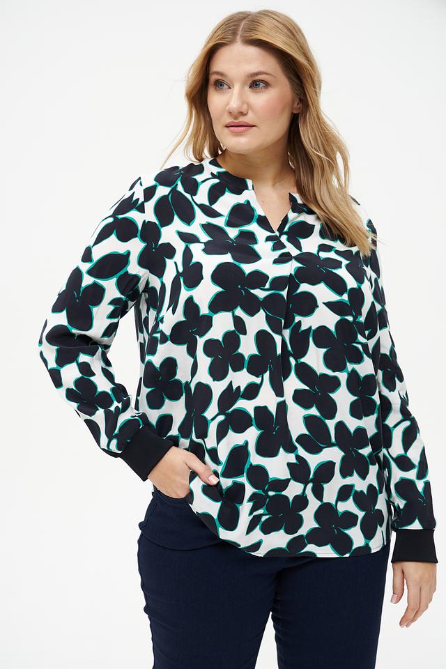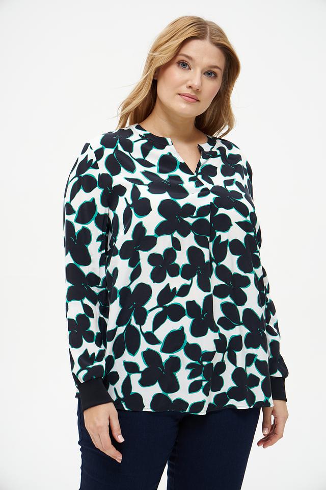 Блуза имеет свободный крой и длинные рукава с манжетами. V-образный вырез горловины добавляет образу элегантности. Основной цвет блузы – белый, украшенный ярким и выразительным цветочным принтом в черных и бирюзовых тонах.