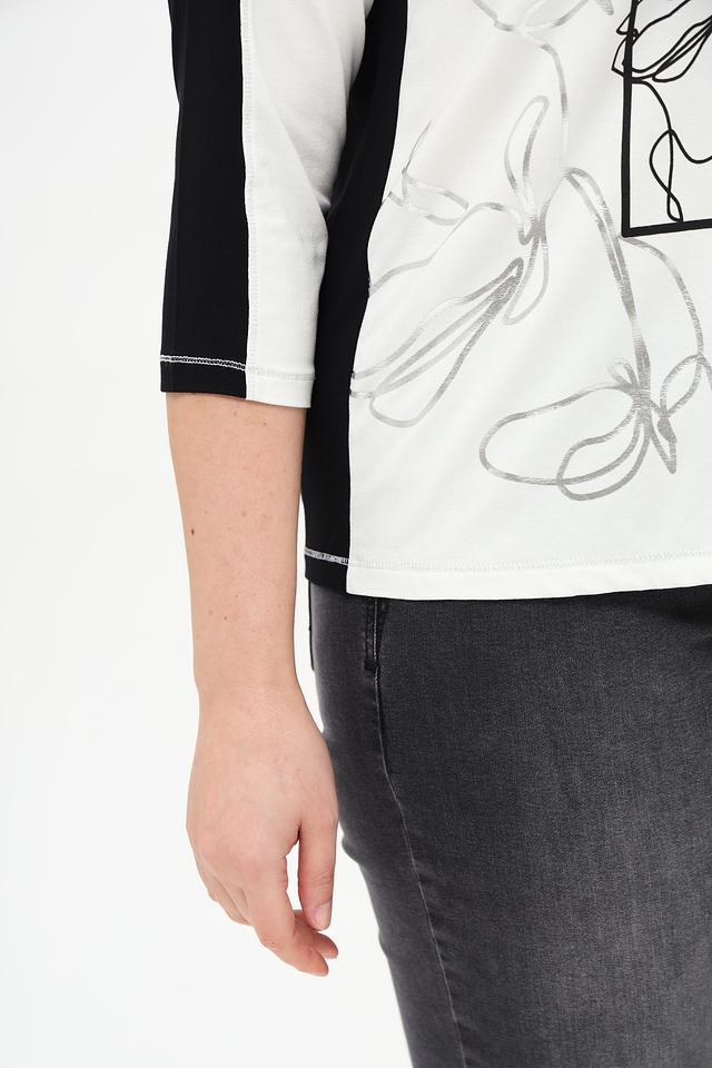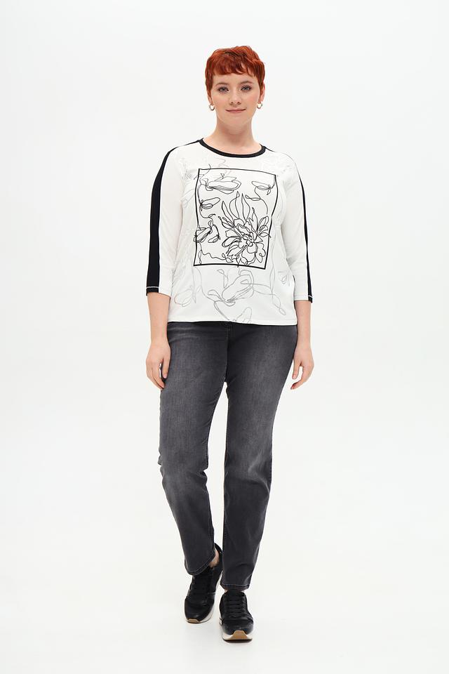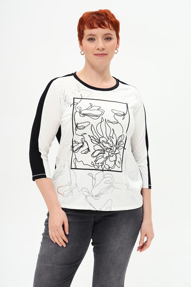 Женская футболка Frank Walder белого цвета с оригинальным цветочным принтом и контрастными черными рукавами. Изготовлена из мягкой вискозы с добавлением эластана для комфорта и свободы движений. Состав: вискоза 95%, эластан 5%