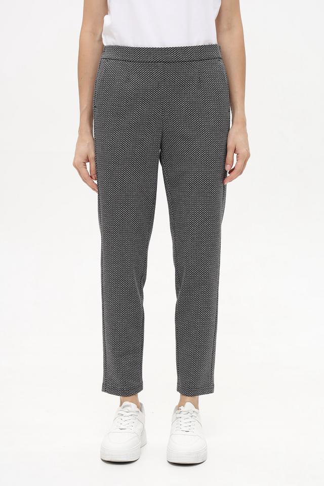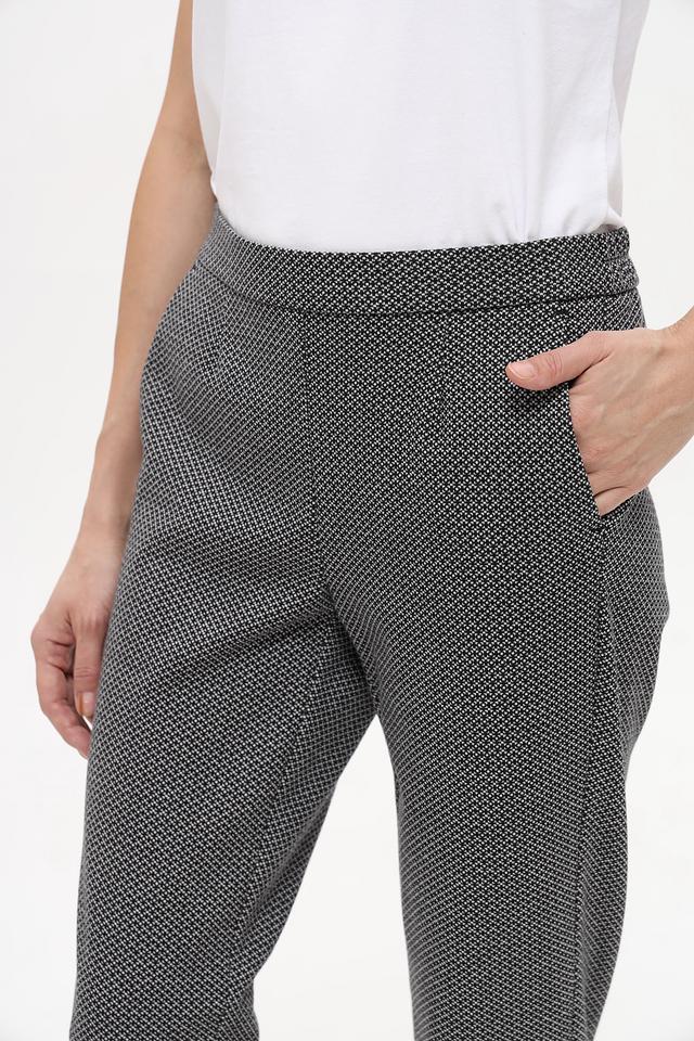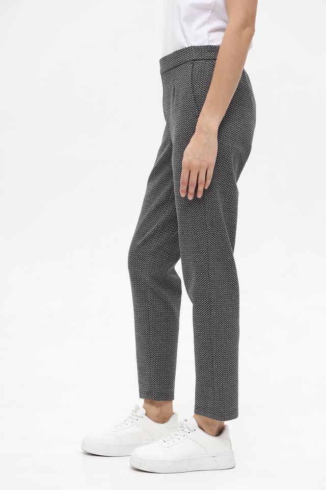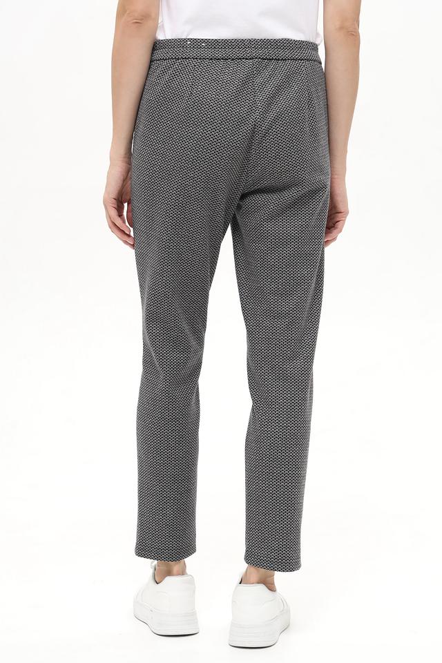 Женские брюки Frank Walder серого цвета с мелким клетчатым принтом. Модель выполнена с эластичным поясом и слегка зауженным силуэтом, что обеспечивает комфортную посадку и стильный вид. Состав: полиэстер 56%, хлопок 43%, эластан 1%