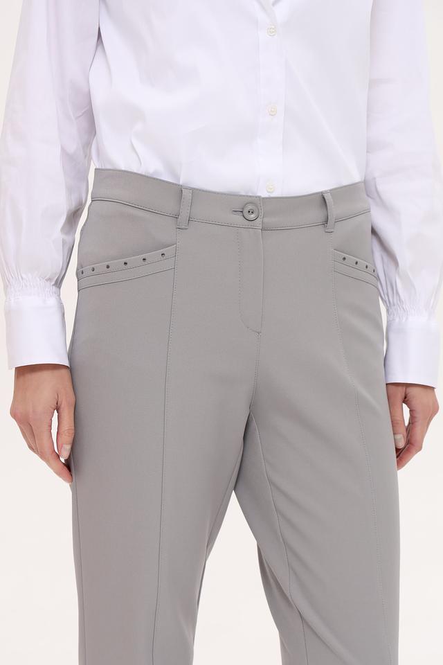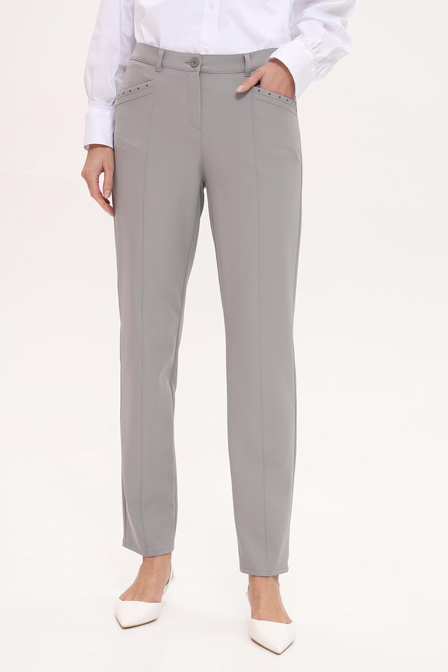 Передние части брюк украшены аккуратными декоративными элементами в виде небольших страз, добавляющих изысканности. Застежка – молния и пуговица. Брюки идеально сочетаются с блузками, рубашками и жакетами, создавая завершенный и стильный образ.