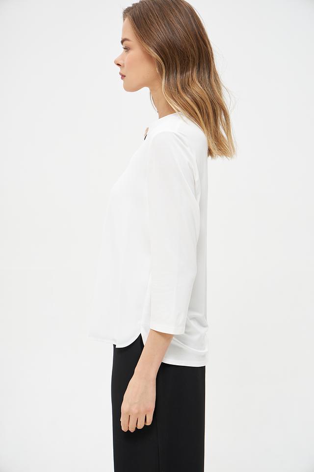 Модель имеет V-образный вырез горловины, который визуально удлиняет шею и придает образу женственности. Рукава длиной 3/4 делают блузку универсальной и подходящей для любого времени года.