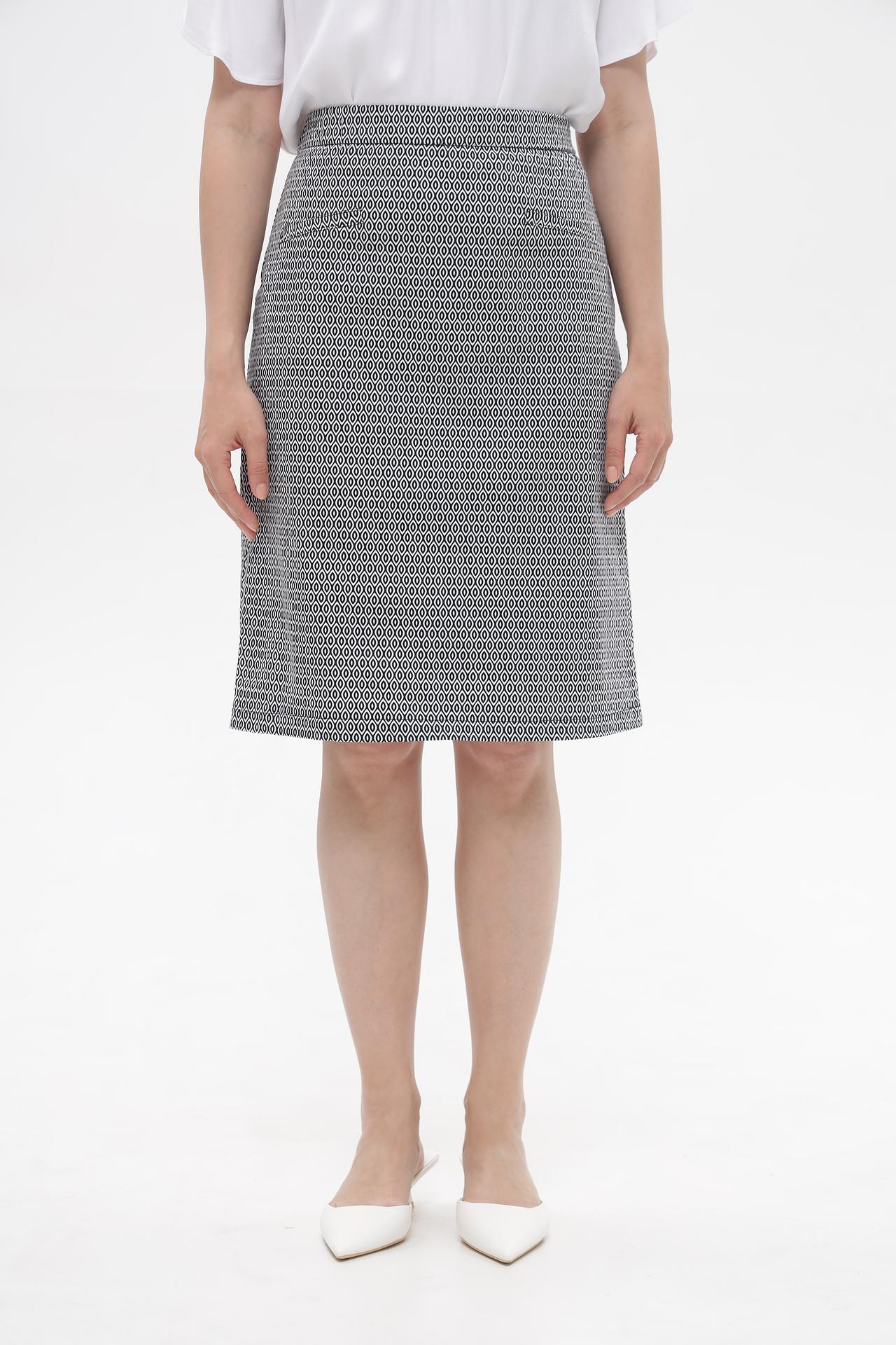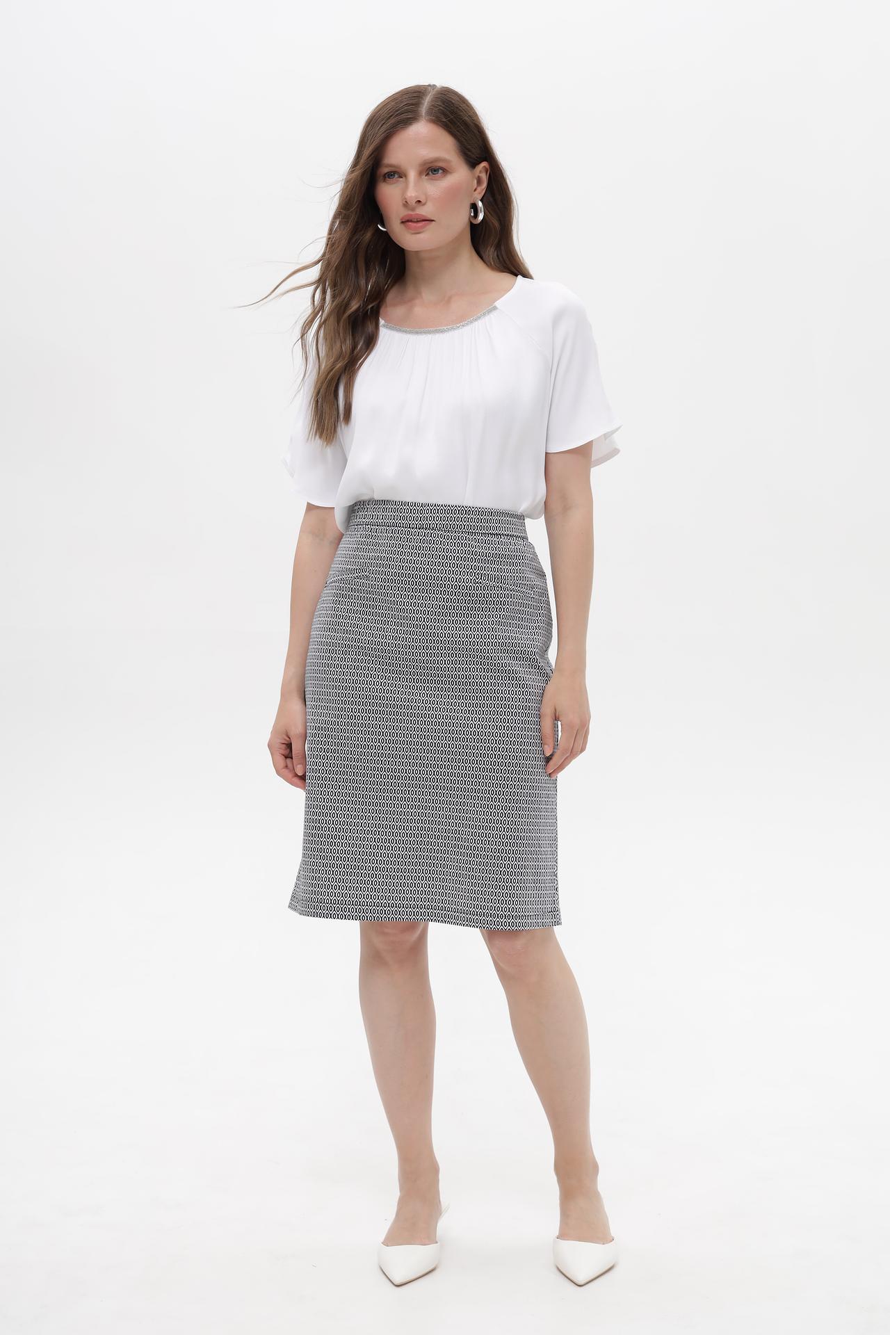 - Дизайн и принт: Классический крой юбки дополнен актуальным мелким геометрическим принтом в серо-черных тонах. Такой узор придает изделию особую изысканность и делает его универсальным элементом гардероба.