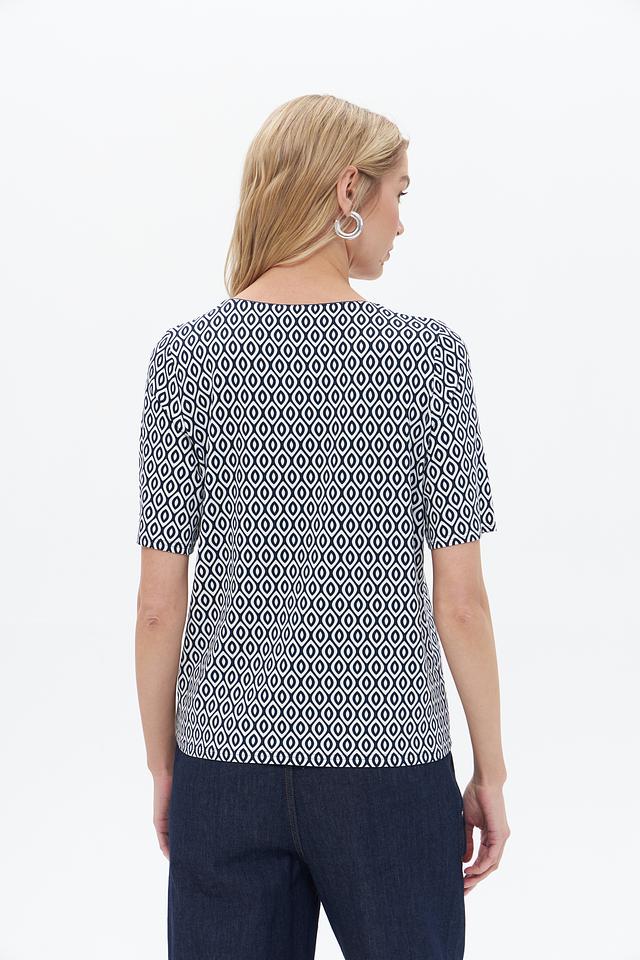 Основной цвет футболки – белый, украшен контрастным чёрным геометрическим принтом. Круглый вырез горловины и короткие рукава делают эту модель универсальной и подходящей для различных образов.