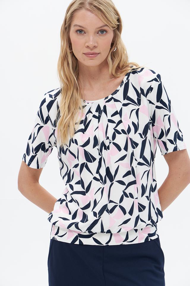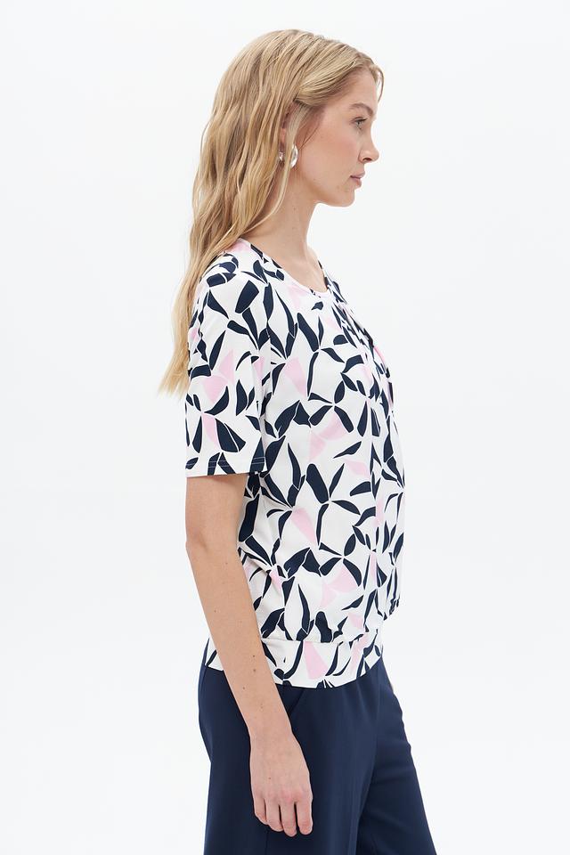 Блуза имеет свободный крой и короткие рукава, что делает её идеальной для тёплой погоды. Основной цвет блузы – белый, а ярким акцентом является оригинальный цветочный принт, выполненный в нежных розовых и тёмно-синих тонах.