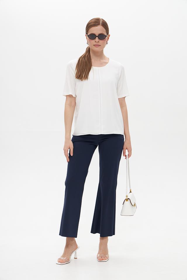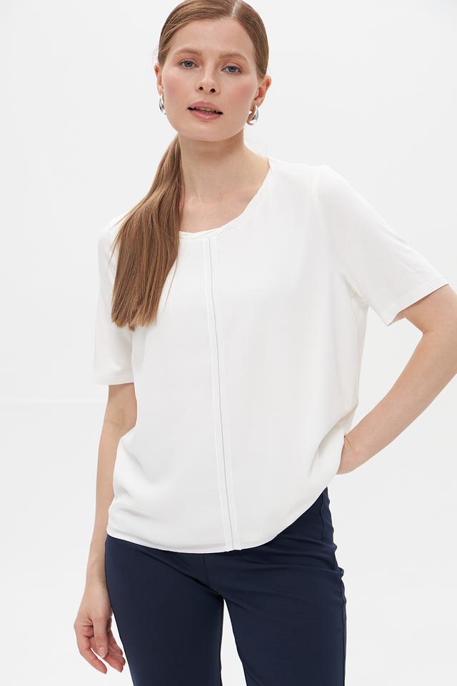 Модель имеет прямой, слегка свободный крой, который не сковывает движений и хорошо скрывает недостатки фигуры. Круглый вырез горловины и короткие рукава делают блузку идеальной для теплой погоды. Декоративные вертикальные разрезы по центру переда придают изделию изысканность и оригинальность.