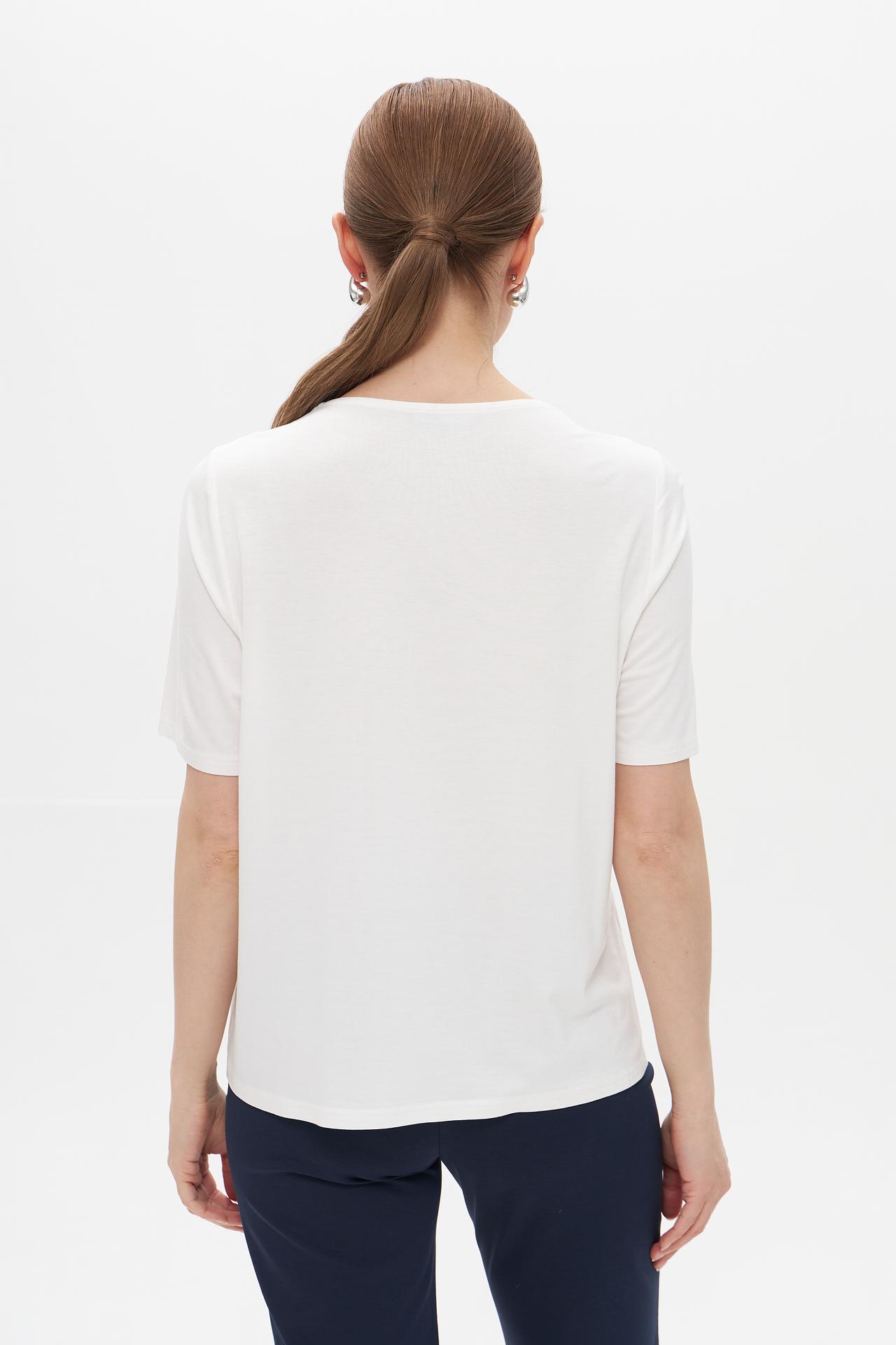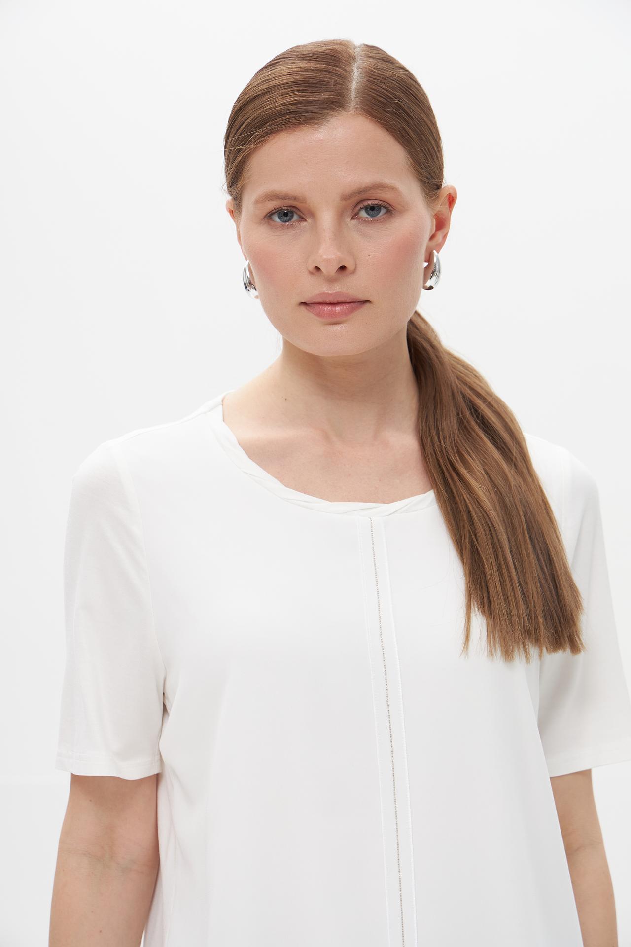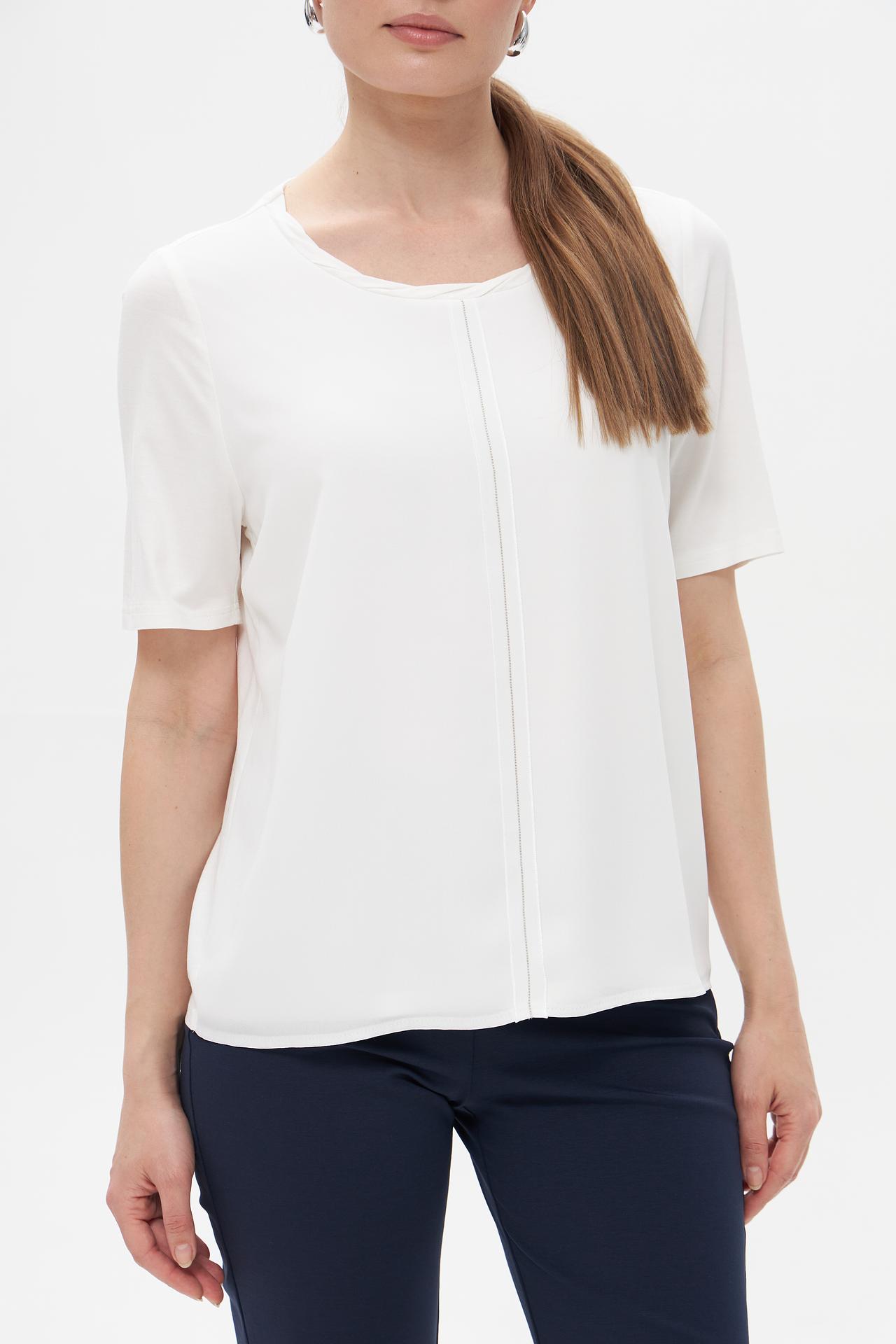 Центральная вертикальная строчка спереди придает изделию утонченности и визуально вытягивает силуэт. Круглый вырез горловины и короткие рукава создают универсальный образ, легко комбинируемый с брюками или юбками. Чистый белый цвет освежает образ, придавая ему легкость и элегантность, что делает блузу незаменимой вещью для любого сезона.