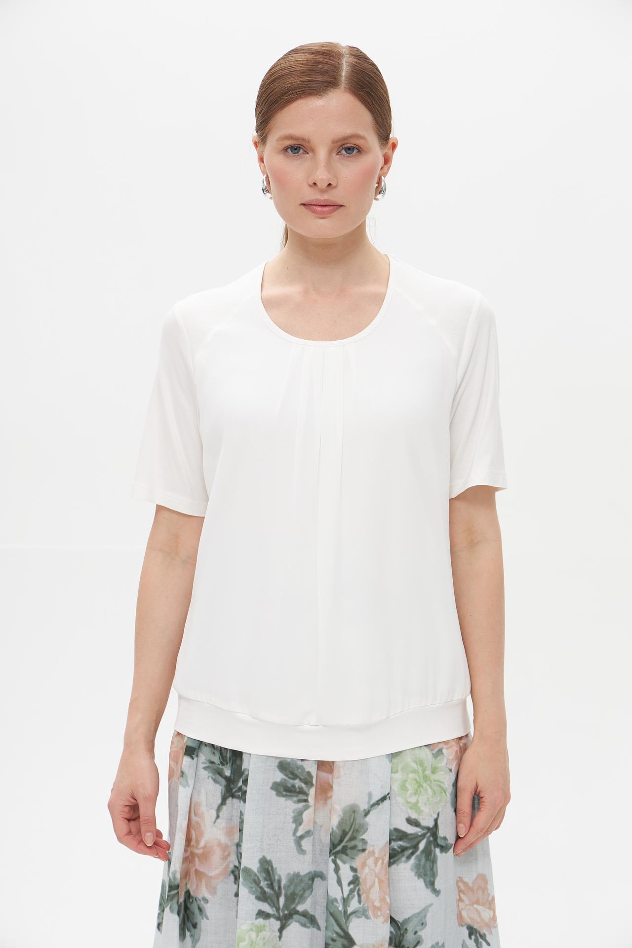 - Элегантный дизайн: Блуза имеет прямой крой с акцентными вертикальными защипами на груди, которые визуально вытягивают силуэт и придают образу изысканность. Чистый белый цвет подчеркивает благородство и свежесть стиля.