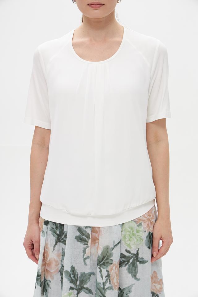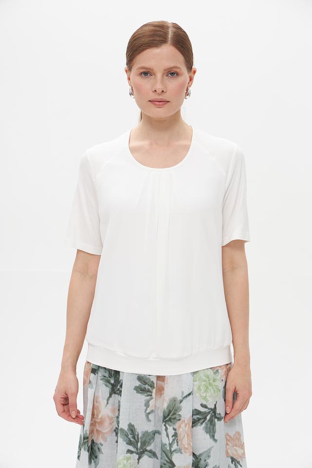 Модель имеет прямой свободный крой, короткие рукава и аккуратный круглый вырез. Передняя часть блузки украшена вертикальной драпировкой, придающей ей элегантность и изысканность.